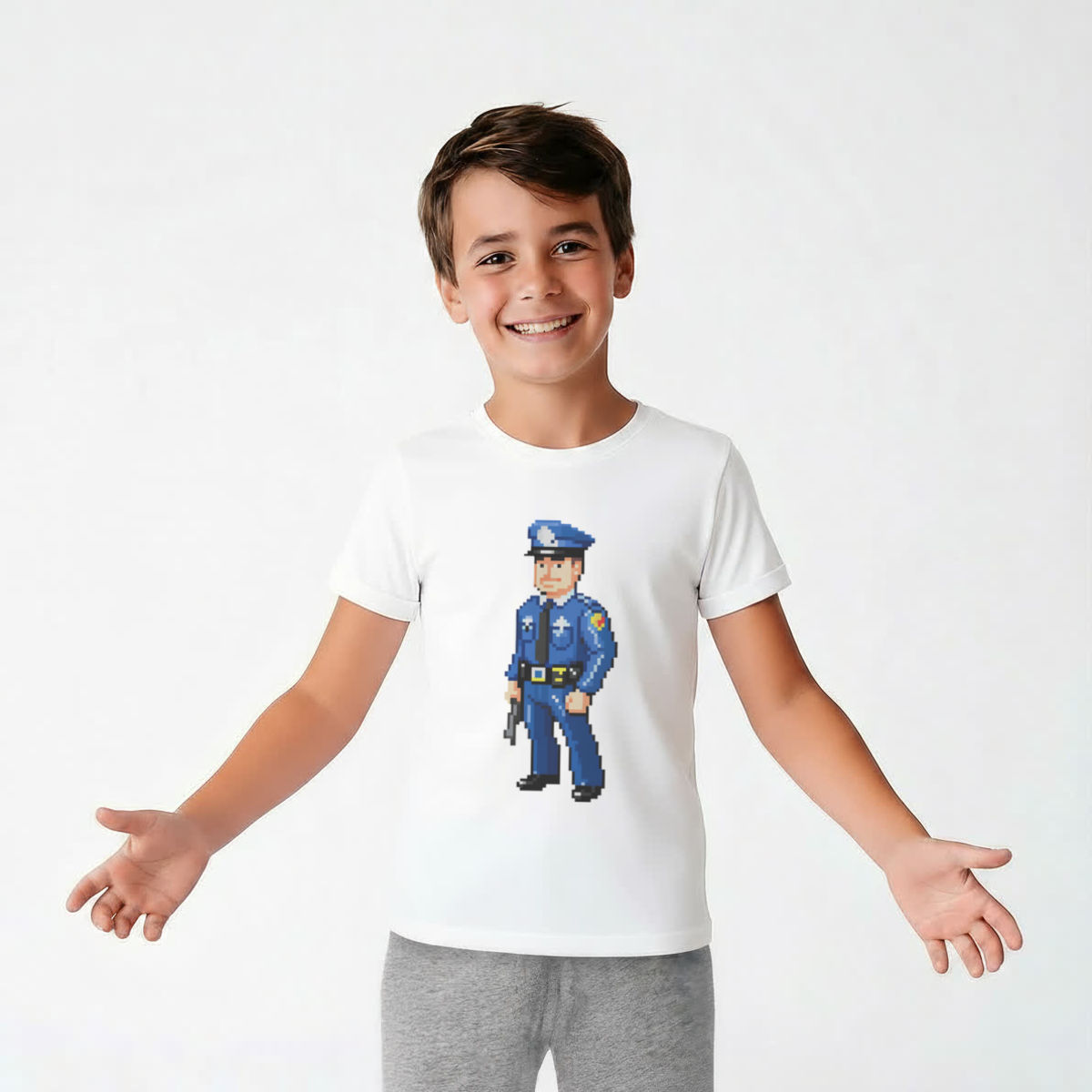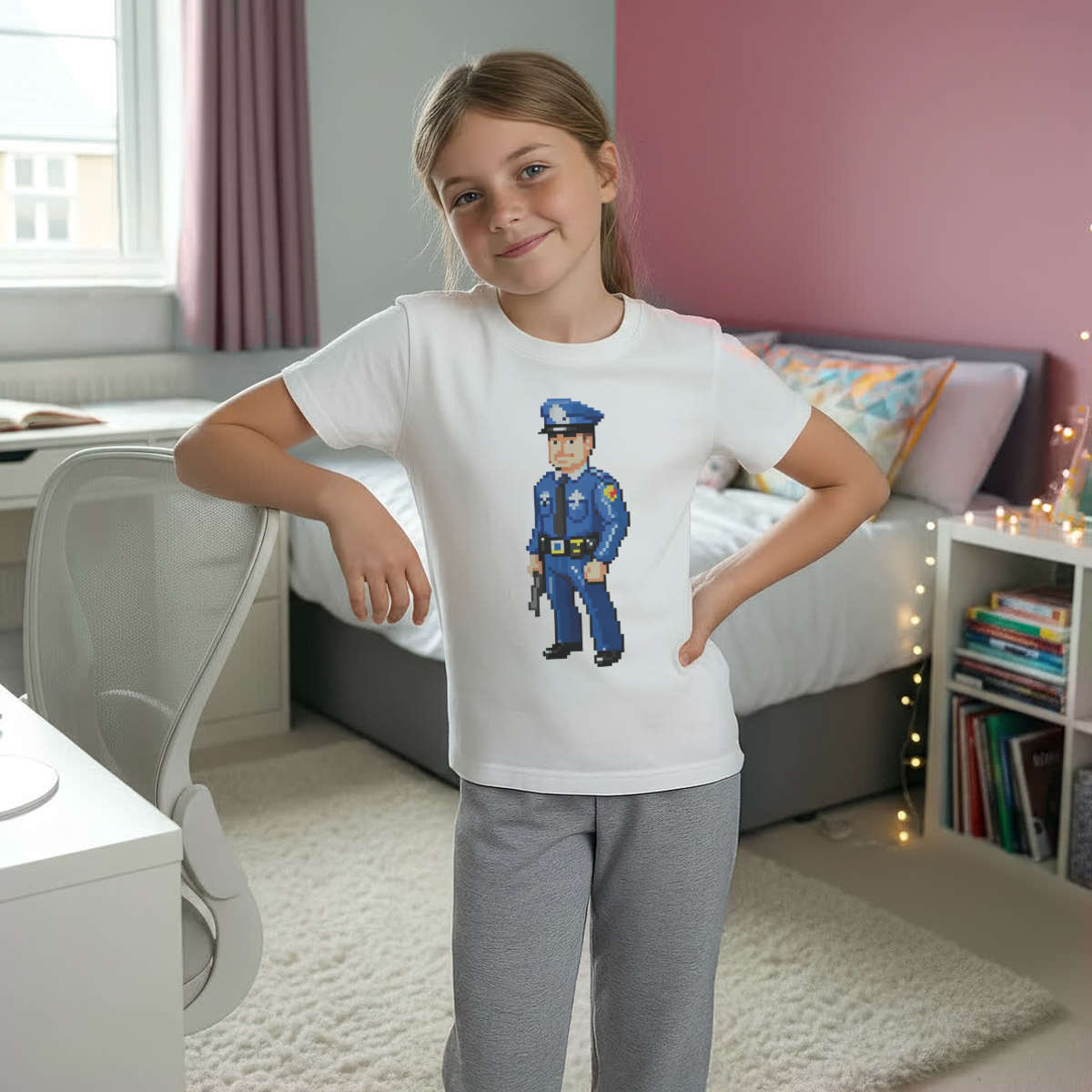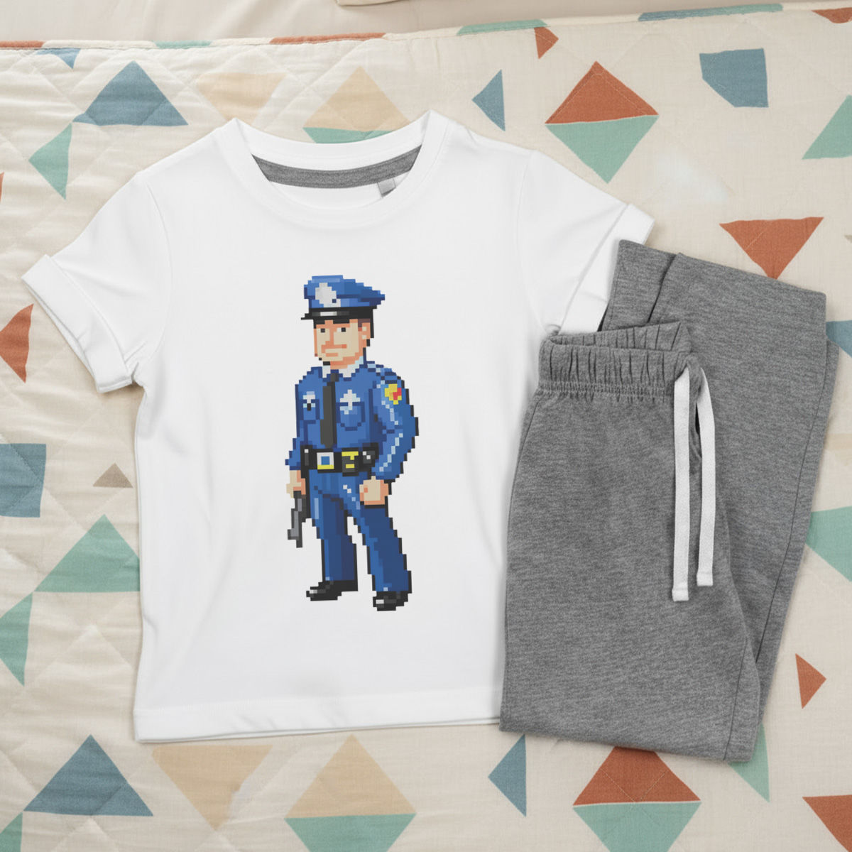 'Pixel Art Police Officer' Kids Cotton Pyjama Set – Comfortable Children's Nightwear, Sleepwear and Loungewear - Unisex for Boys and Girls - Grey, 11-13 Years (KP00164767)