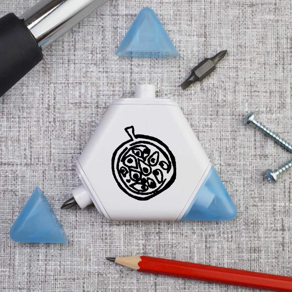 Our triangular compact multi tool is printed on one side with a unique design, making it a great gift for DIY lovers. This 3-in-1 tool set contains a tape measure and 2 different screwdriver attachments and each corner has a snap shut lid. One corner reveals a 1 meter tape measure, while the others hide two reversible screwdriver attachments, one larger and one smaller, both of which have a cross head on one end and a flat head on the other.
