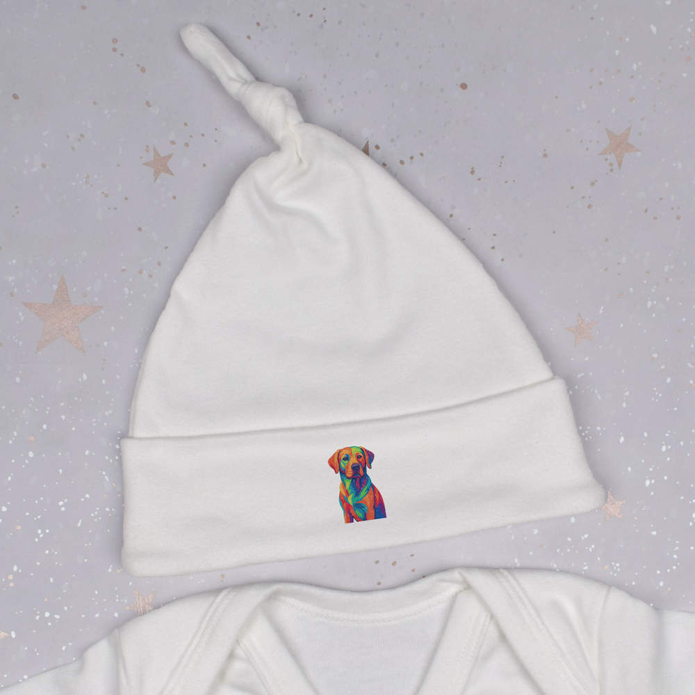 Keep little ones cosy and stylish with this super soft beanie hat. Our baby beanie hats have a knotted top and are printed on the turnover with a unique design. Made from 100% cotton, it can be machine washed and still retain its shape. This beanie hat has a stretch fit so one size fits all, with an approximate circumference of 32cm, it's ideal for babies up to 12 months old.