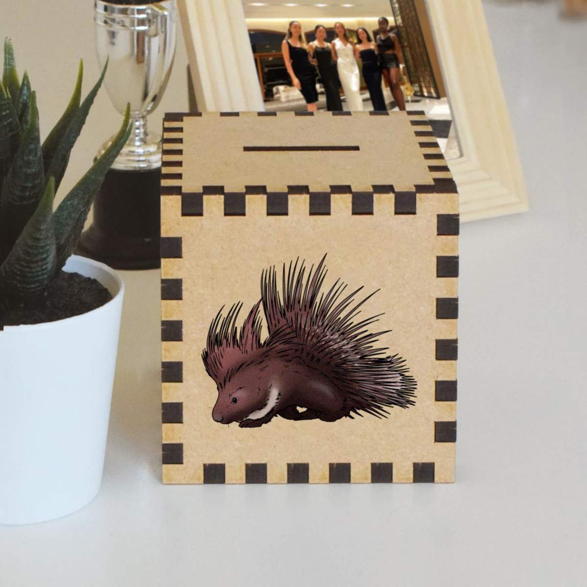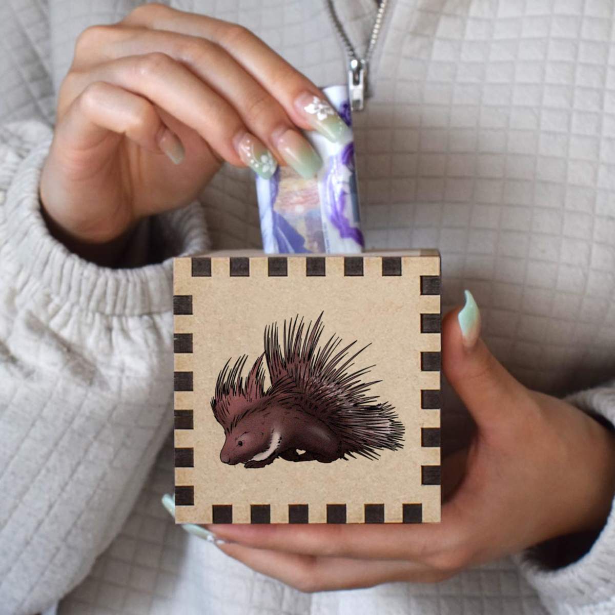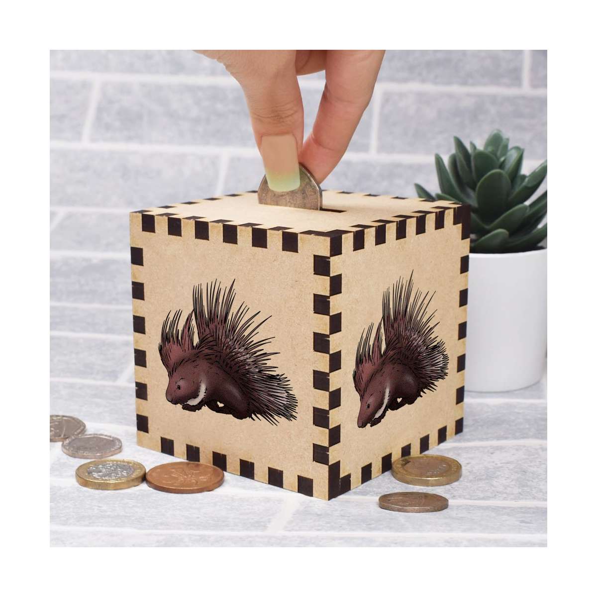 An 8.5cm wooden money box made out of the finest quality MDF and printed on all four sides with a unique design. The bottom is flat and the top has a slot for coins, the box itself is 85mm on each side, with a 35mm x 5mm coin slot, so please be sure it's suitable for you.