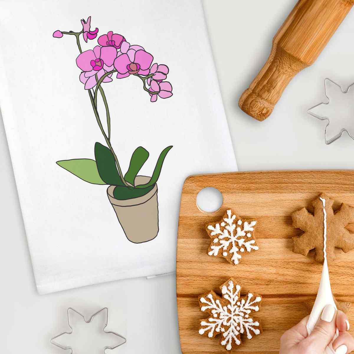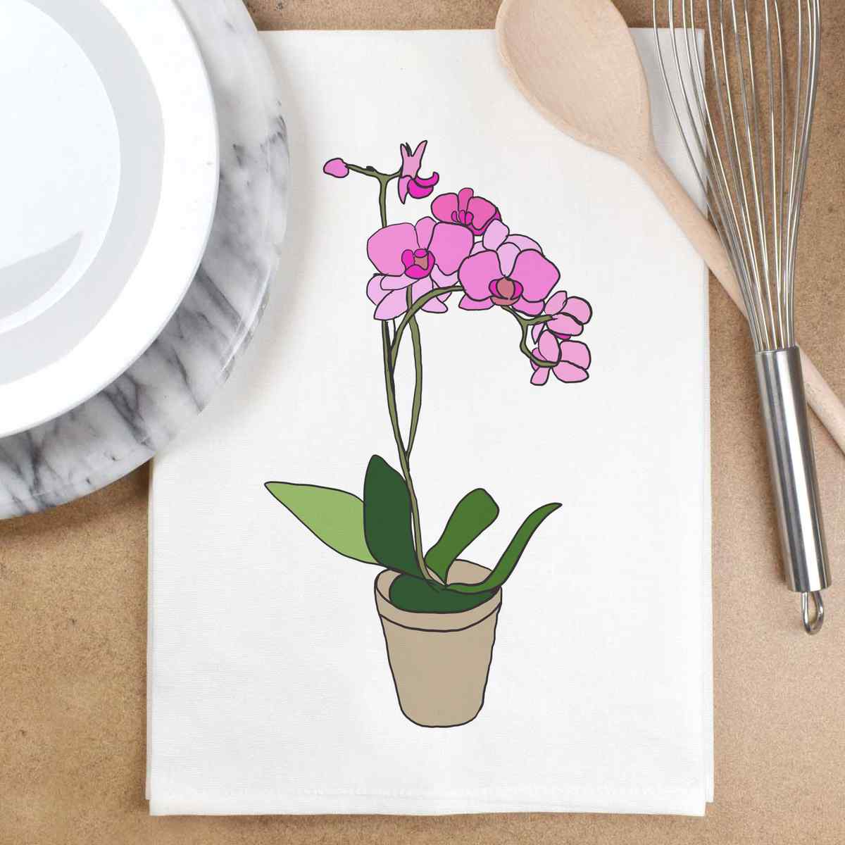 'Potted Orchid' White Cotton Tea Towel / Dish Cloth (TW00013528)