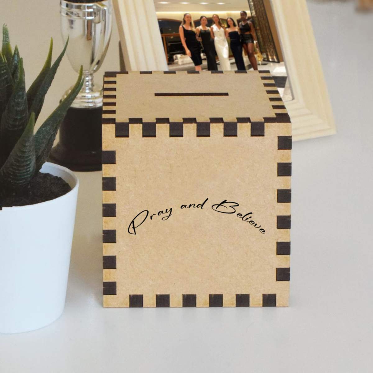 An 8.5cm wooden money box made out of the finest quality MDF and printed on all four sides with a unique design. The bottom is flat and the top has a slot for coins, the box itself is 85mm on each side, with a 35mm x 5mm coin slot, so please be sure it's suitable for you.