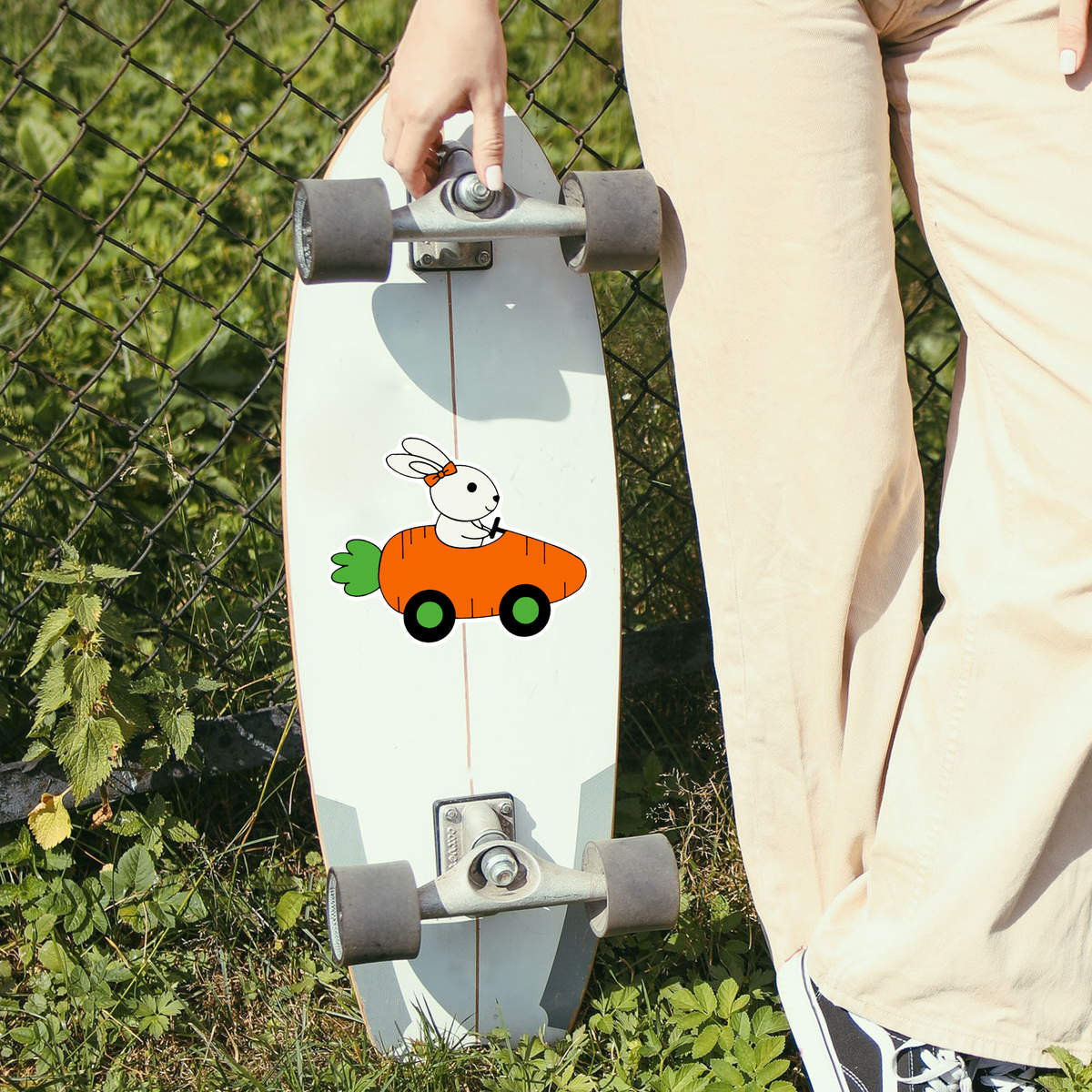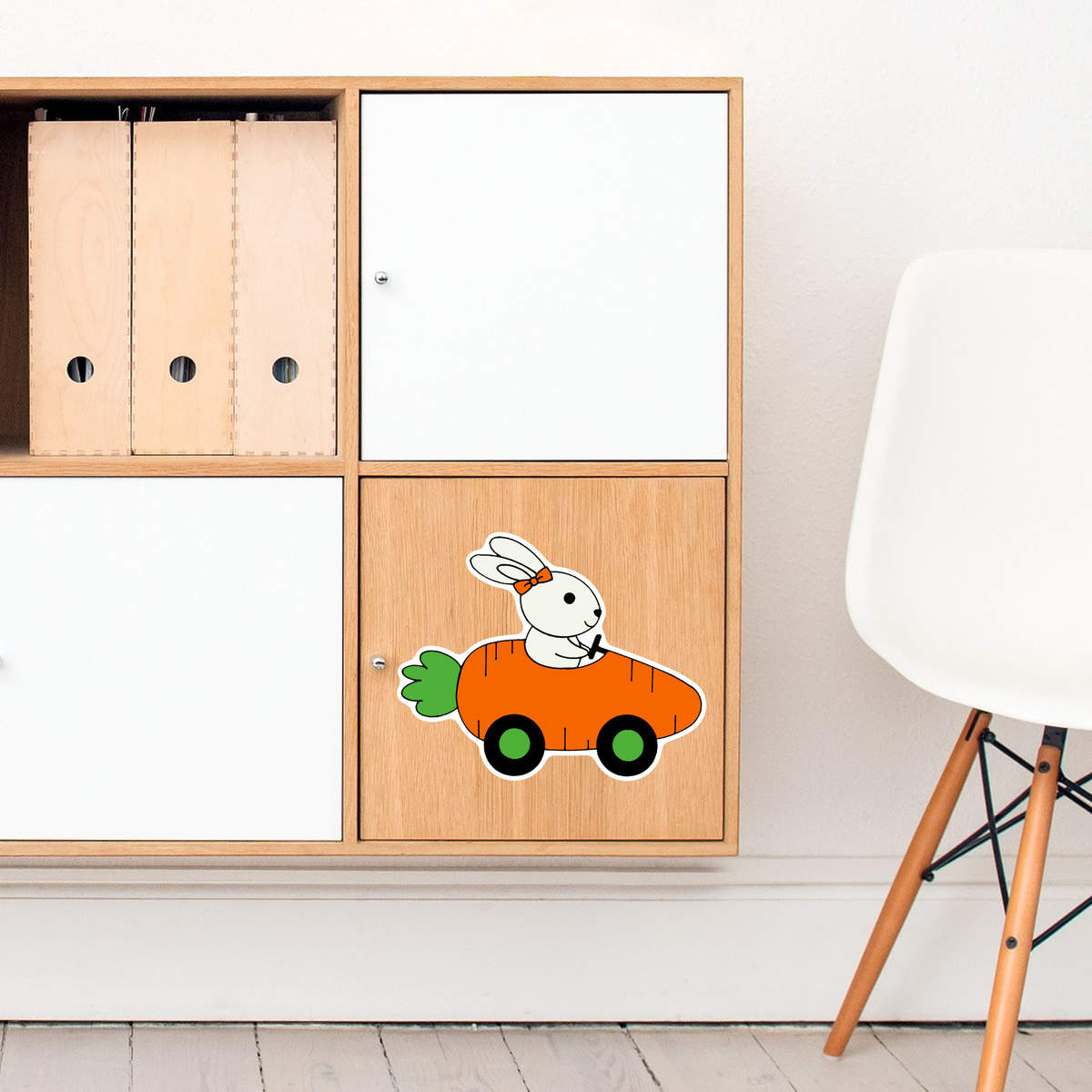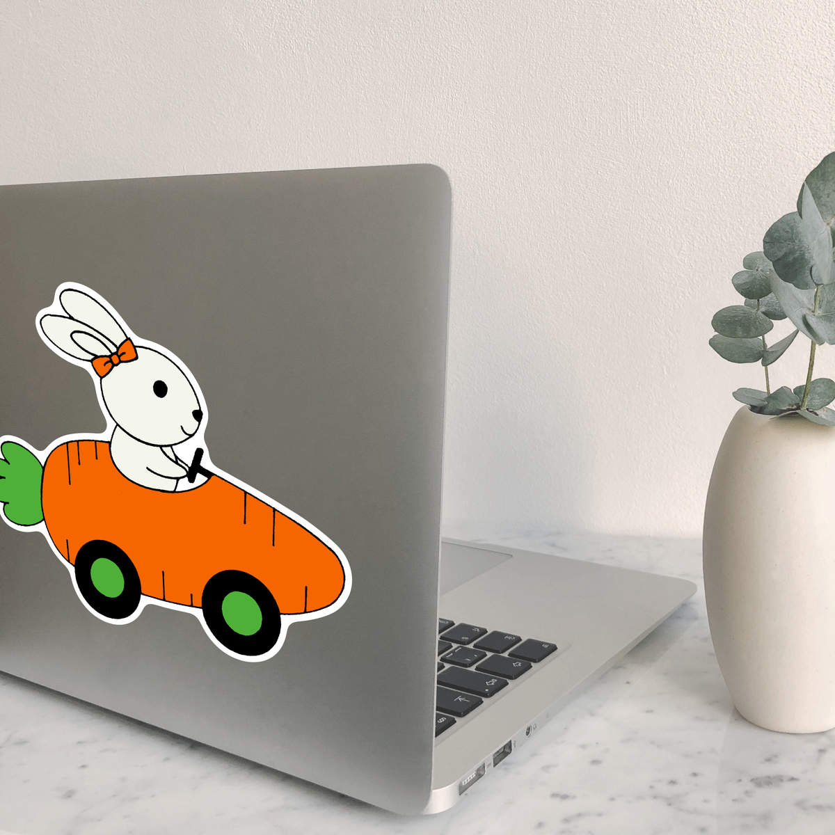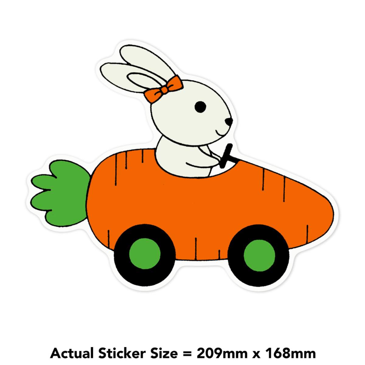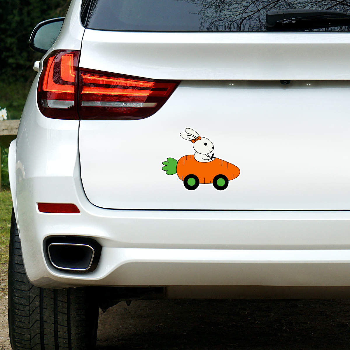 'Rabbit Driving Carrot Car' White Premium Vinyl Decal Sticker – Waterproof, Durable & Easy to Apply - For Car Bumpers, Windows, Bins & More - Large (210mm) (DW00064775)