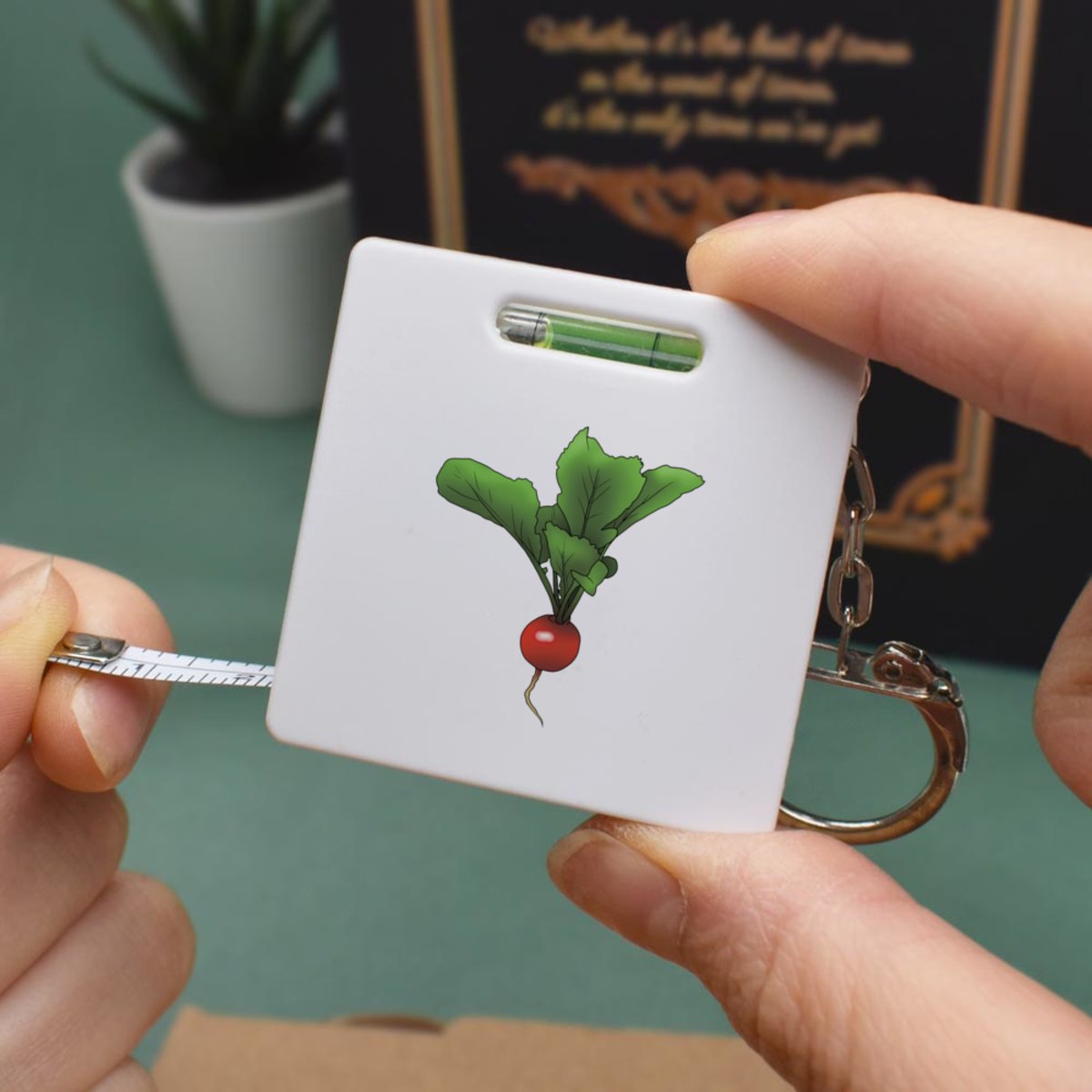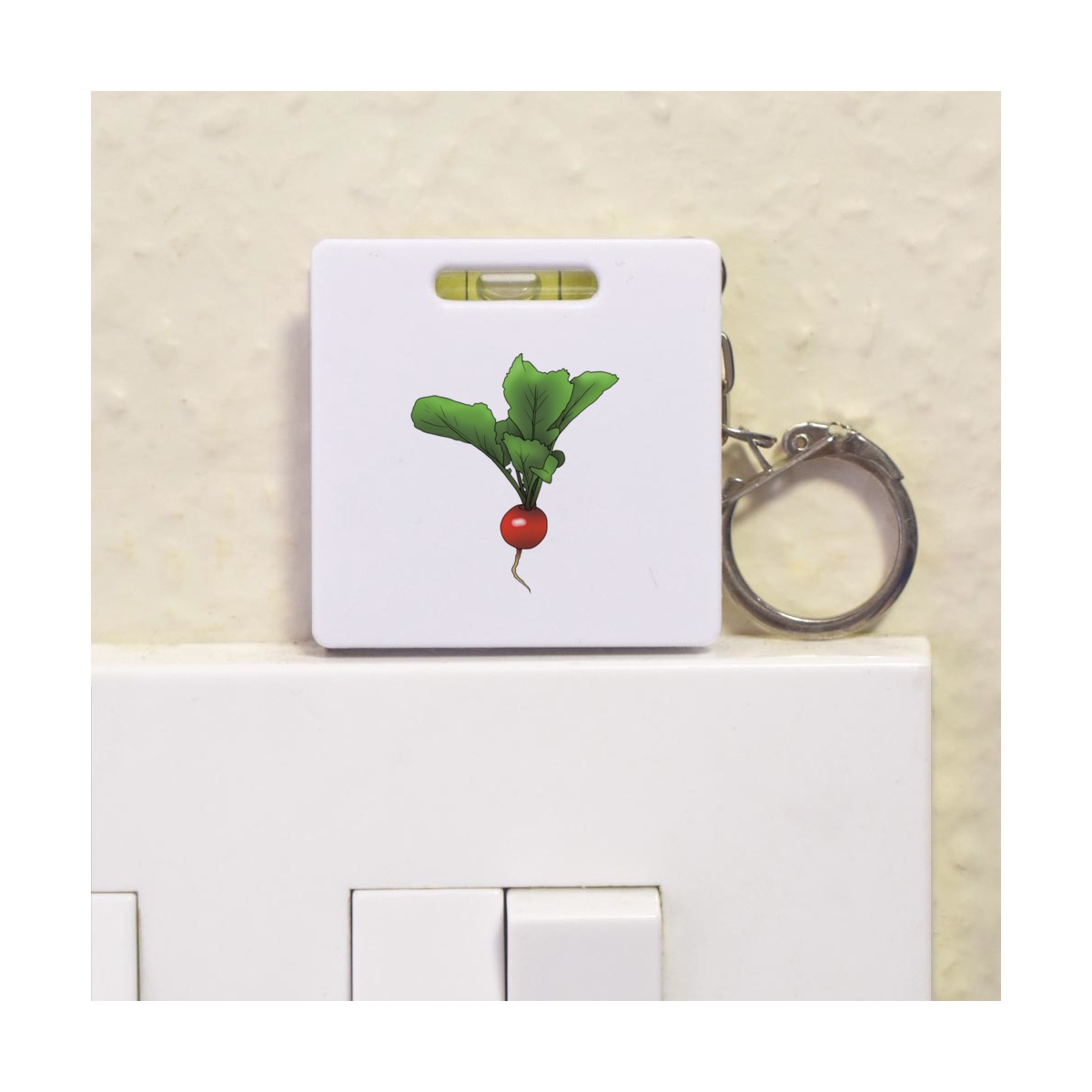 This multifunctional tool offers both a tape measure and spirit level in one handy little accessory. The retractable, 1 metre tape measure has both imperial and metric units, while the flat edges around its plastic casing provide the ability to check both vertical and horizontal surfaces with a mini spirit level. The compact and lightweight design makes it easy to carry around; simply attach with the keychain provided and whip it out when needed. Each keyring tape measure tool is printed on one side with a unique design.