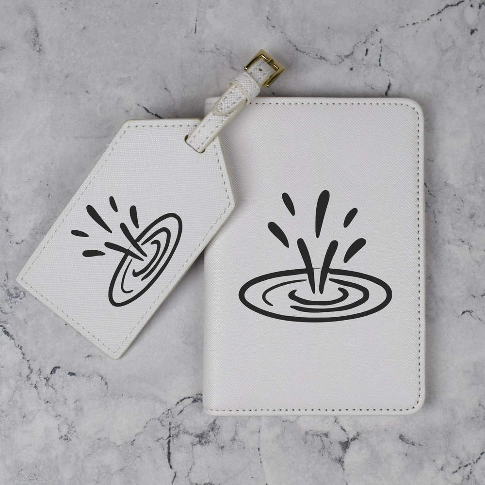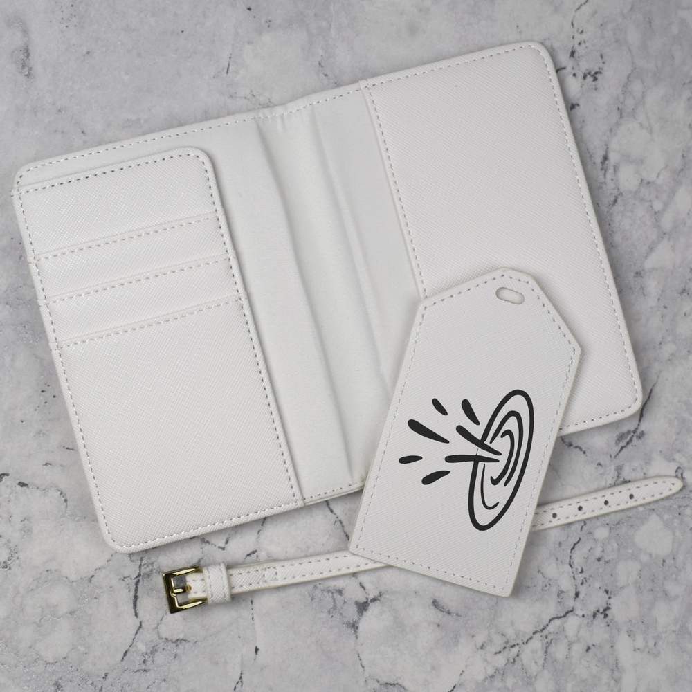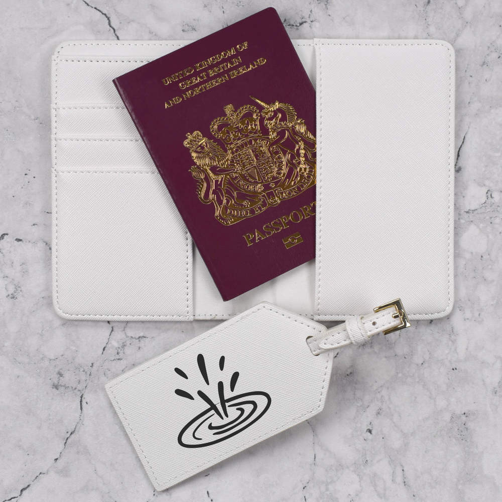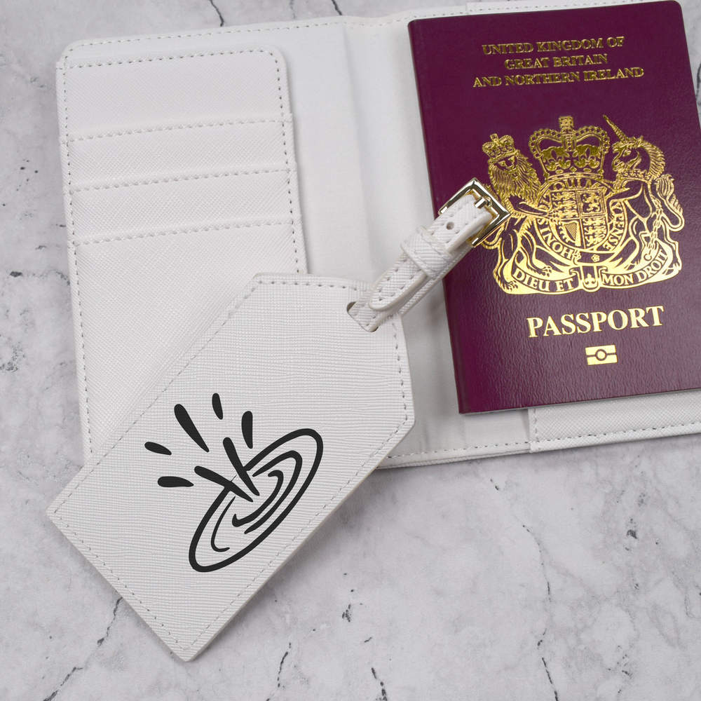 A luxury travel set for holiday makers and jet setters! This premium duo consists of a passport cover and matching luggage tag; both made from white, leather-look PU and printed with a unique design.