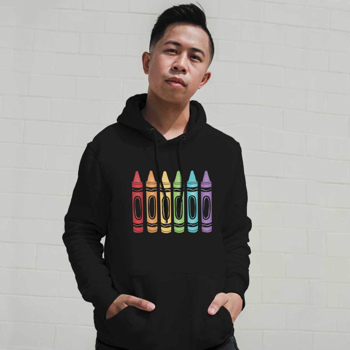 'A row of crayons set out like a rainbow.'