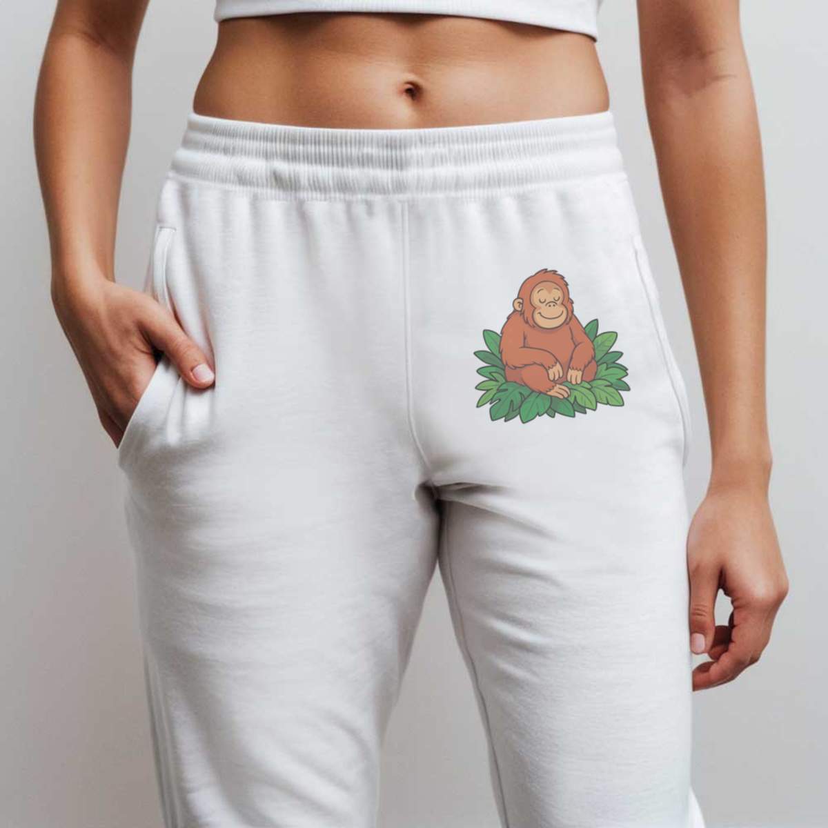 'A relaxed orangutan sitting in some leaves.'