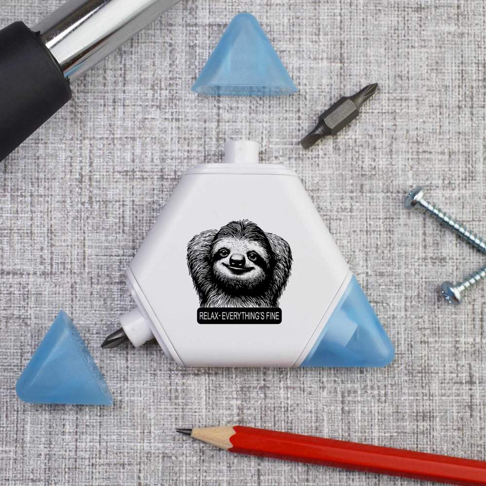 Our triangular compact multi tool is printed on one side with a unique design, making it a great gift for DIY lovers. This 3-in-1 tool set contains a tape measure and 2 different screwdriver attachments and each corner has a snap shut lid. One corner reveals a 1 meter tape measure, while the others hide two reversible screwdriver attachments, one larger and one smaller, both of which have a cross head on one end and a flat head on the other.