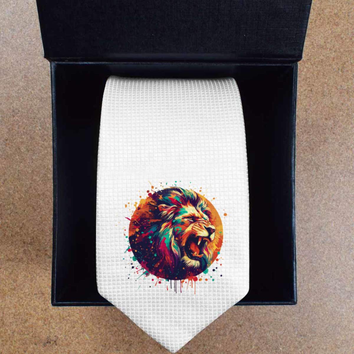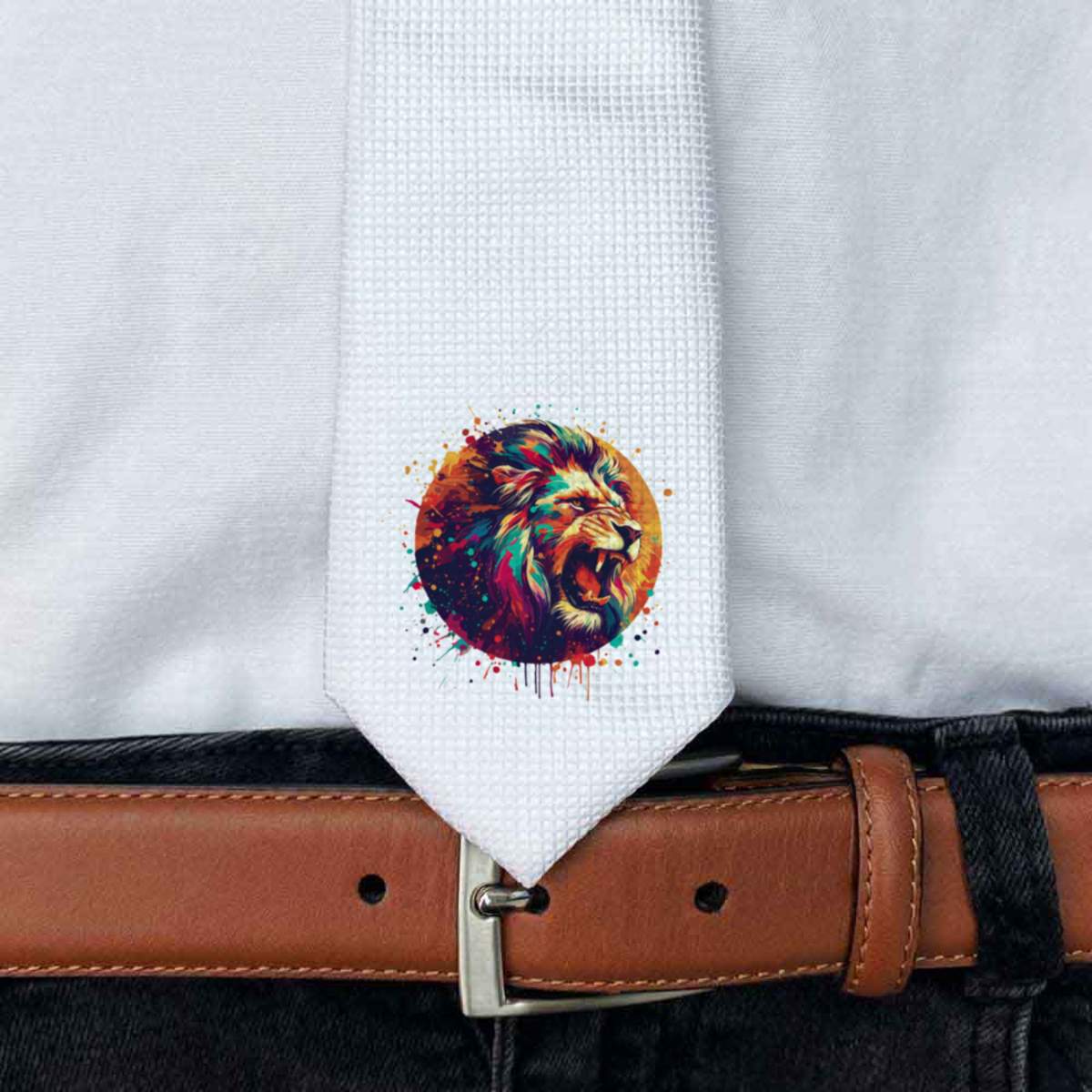 This stylish slim white tie is guaranteed to add class to any outfit. Printed on the front with a design from one of our talented designers, these ties are perfect for formal events, special occasions or making a statement at the office.
