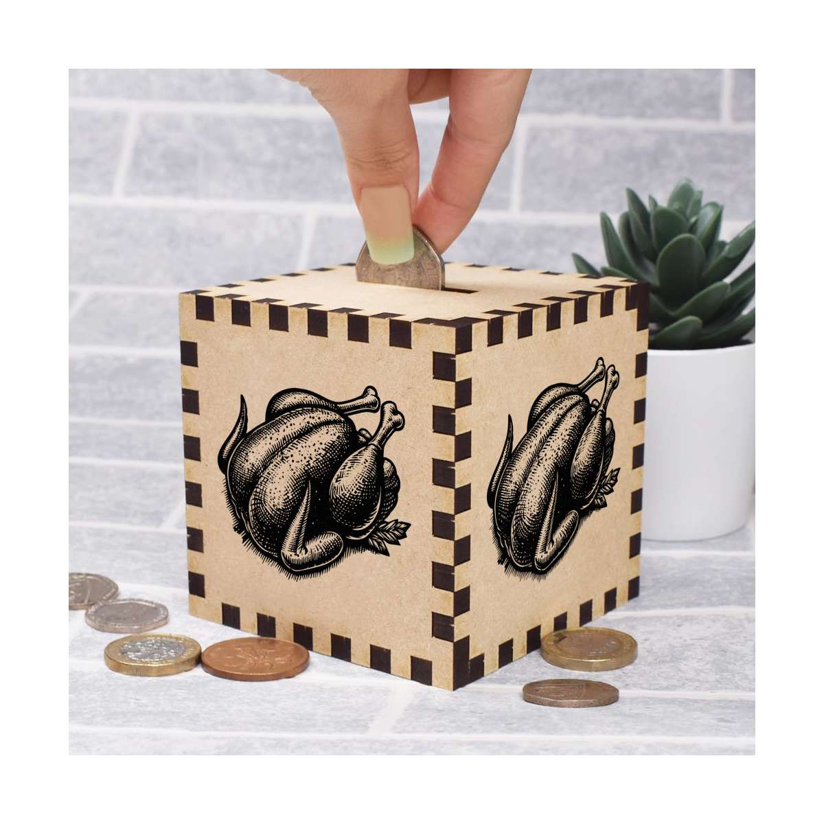 An 8.5cm wooden money box made out of the finest quality MDF and printed on all four sides with a unique design. The bottom is flat and the top has a slot for coins, the box itself is 85mm on each side, with a 35mm x 5mm coin slot, so please be sure it's suitable for you.