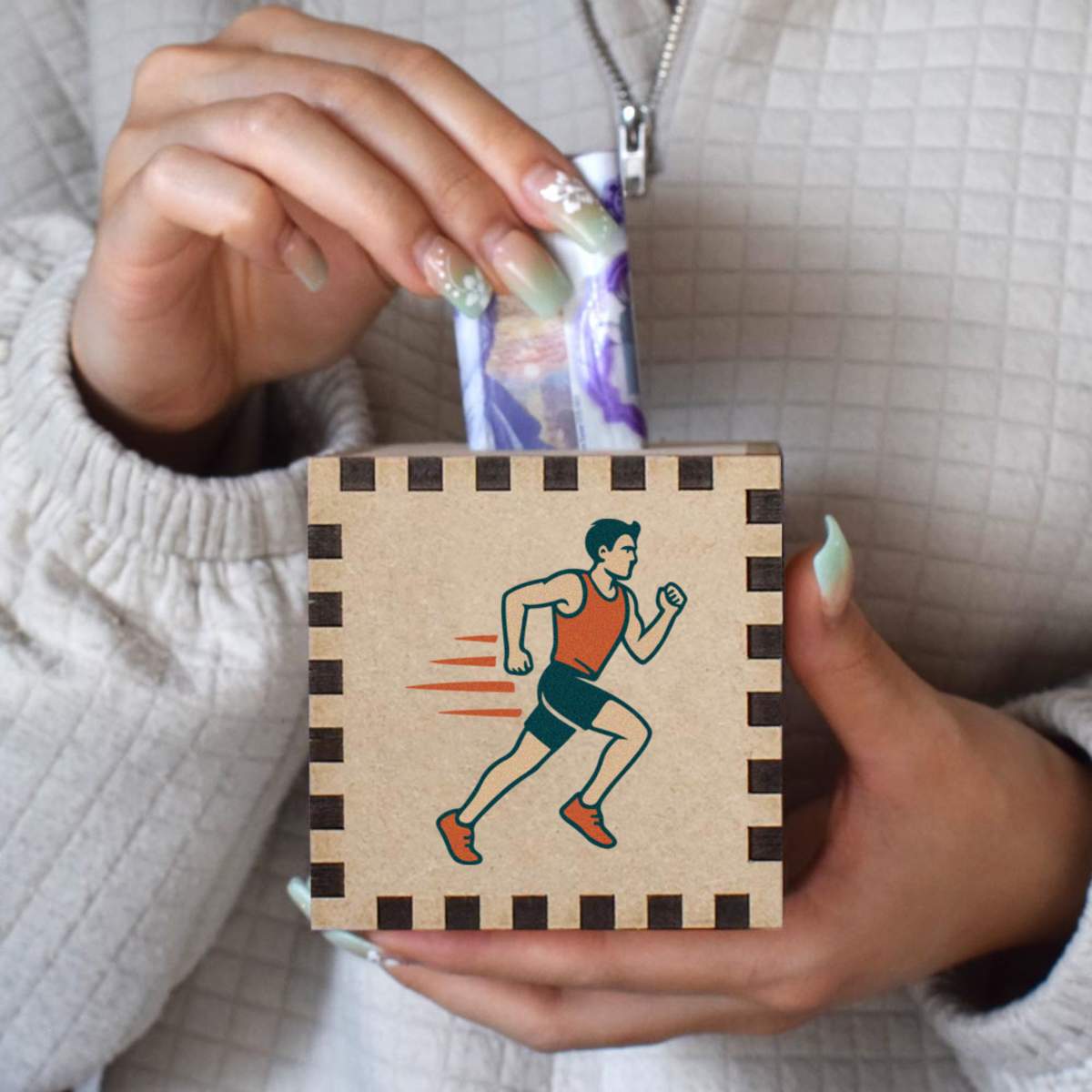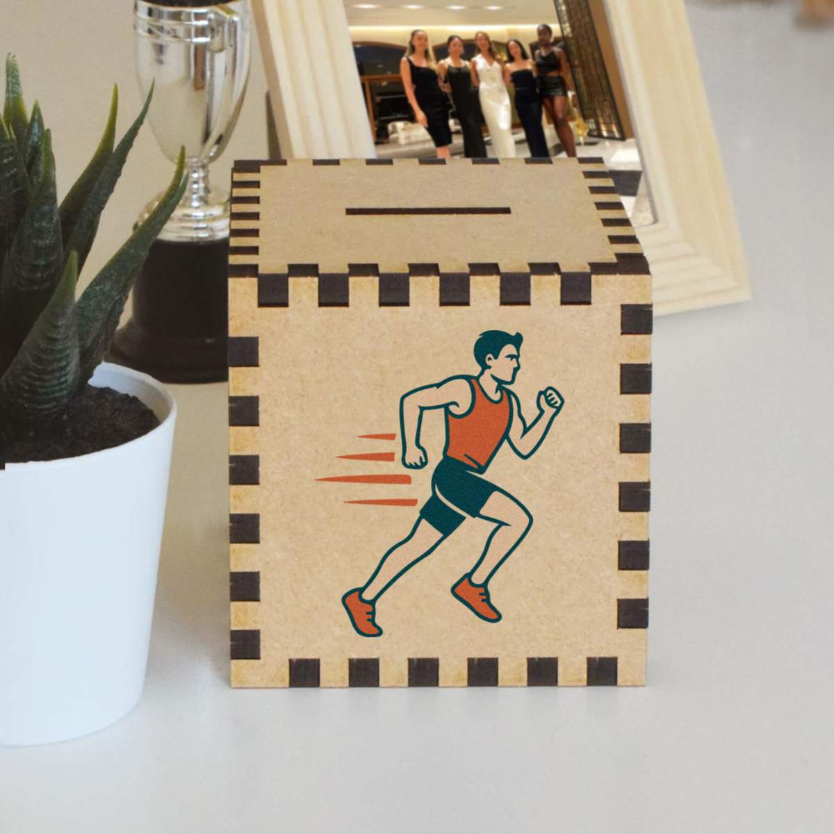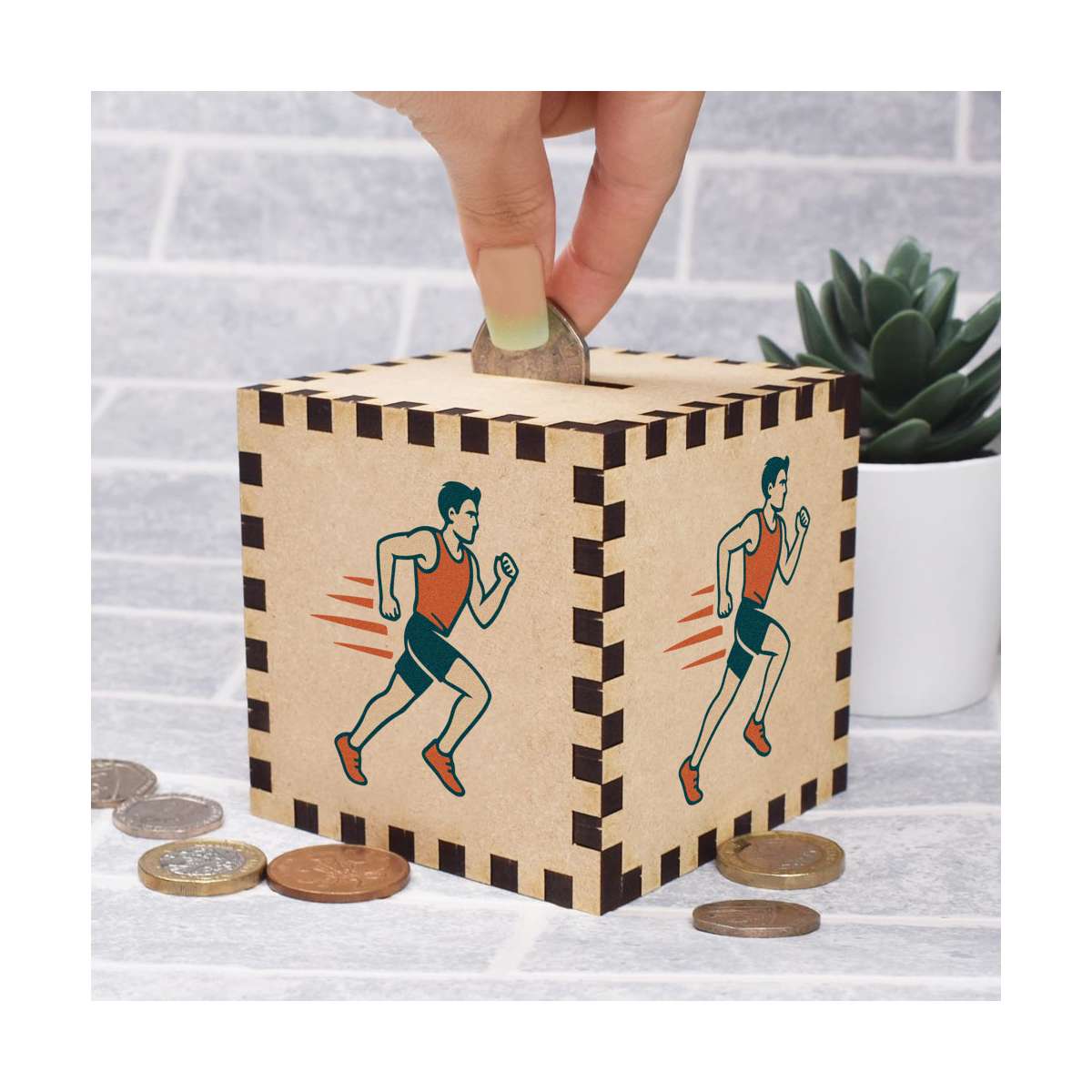 An 8.5cm wooden money box made out of the finest quality MDF and printed on all four sides with a unique design. The bottom is flat and the top has a slot for coins, the box itself is 85mm on each side, with a 35mm x 5mm coin slot, so please be sure it's suitable for you.