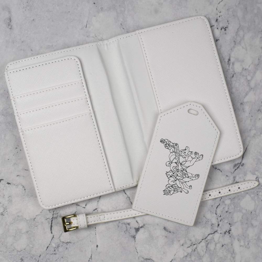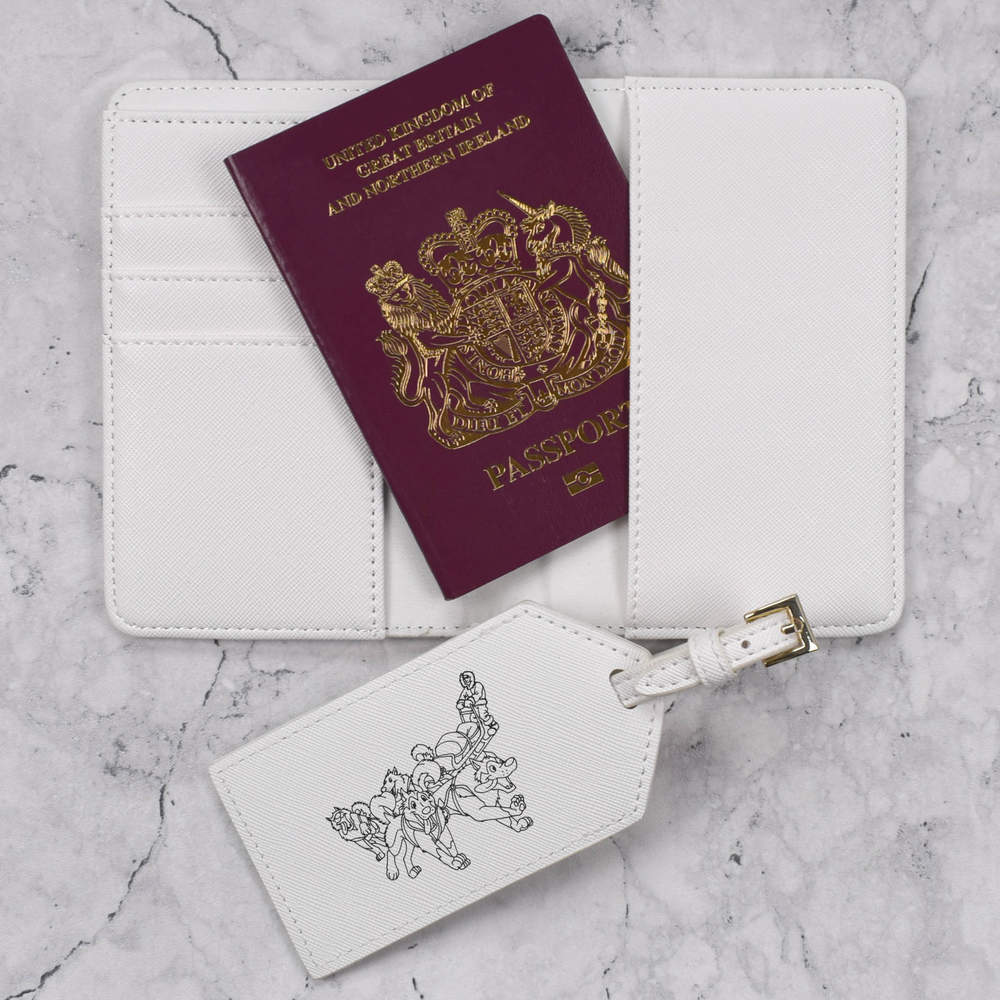 A luxury travel set for holiday makers and jet setters! This premium duo consists of a passport cover and matching luggage tag; both made from white, leather-look PU and printed with a unique design.