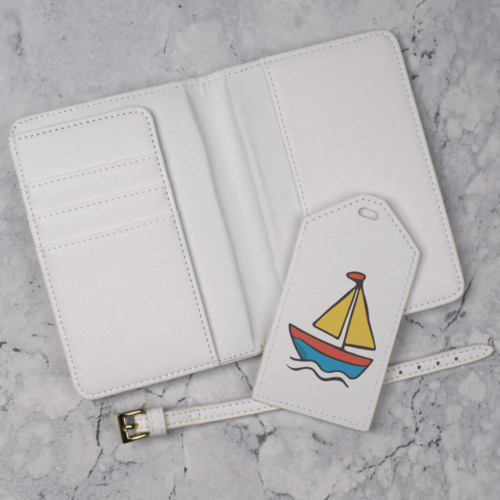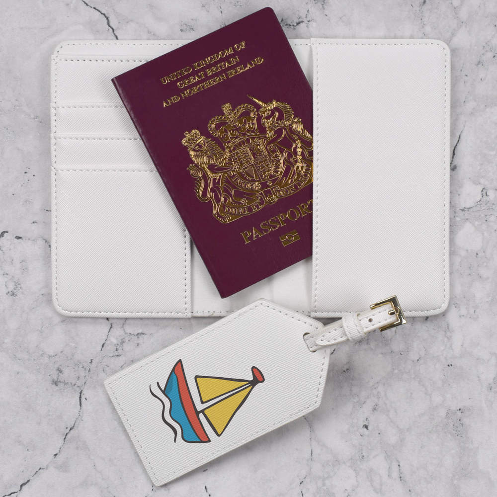 A luxury travel set for holiday makers and jet setters! This premium duo consists of a passport cover and matching luggage tag; both made from white, leather-look PU and printed with a unique design.