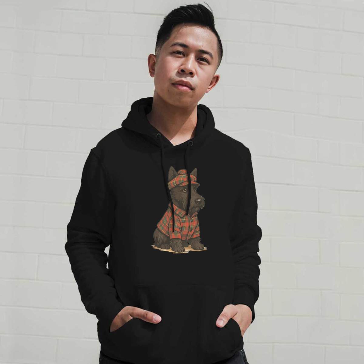 'A Scottish highland terrier wearing traditional tartan Scottish clothing.'