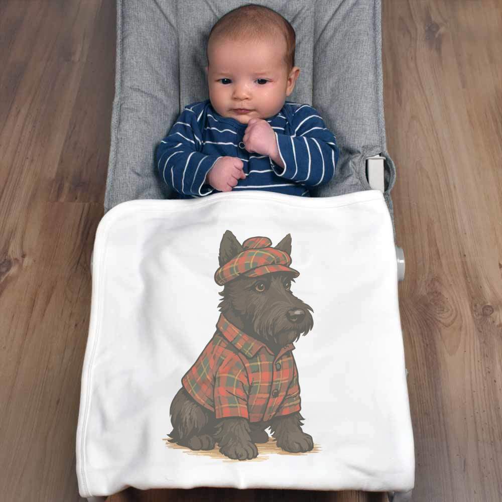 'A Scottish highland terrier wearing traditional tartan Scottish clothing.'