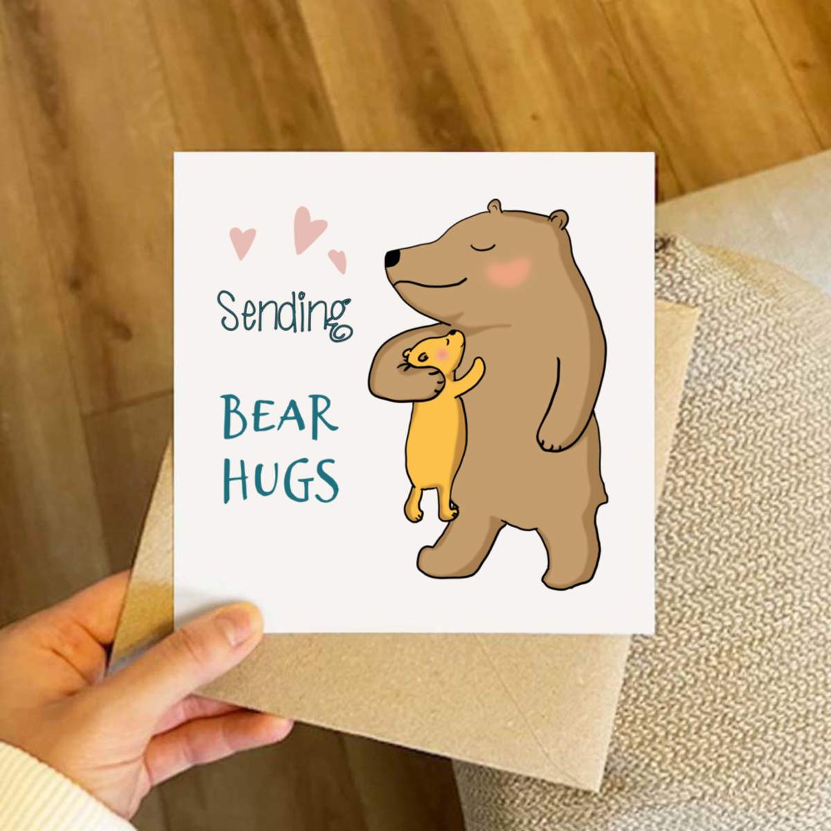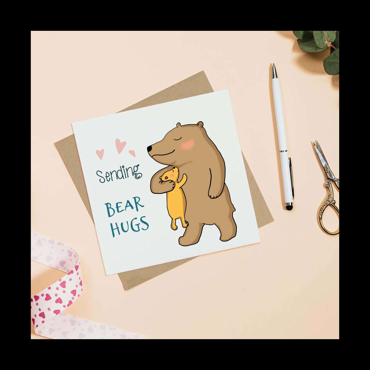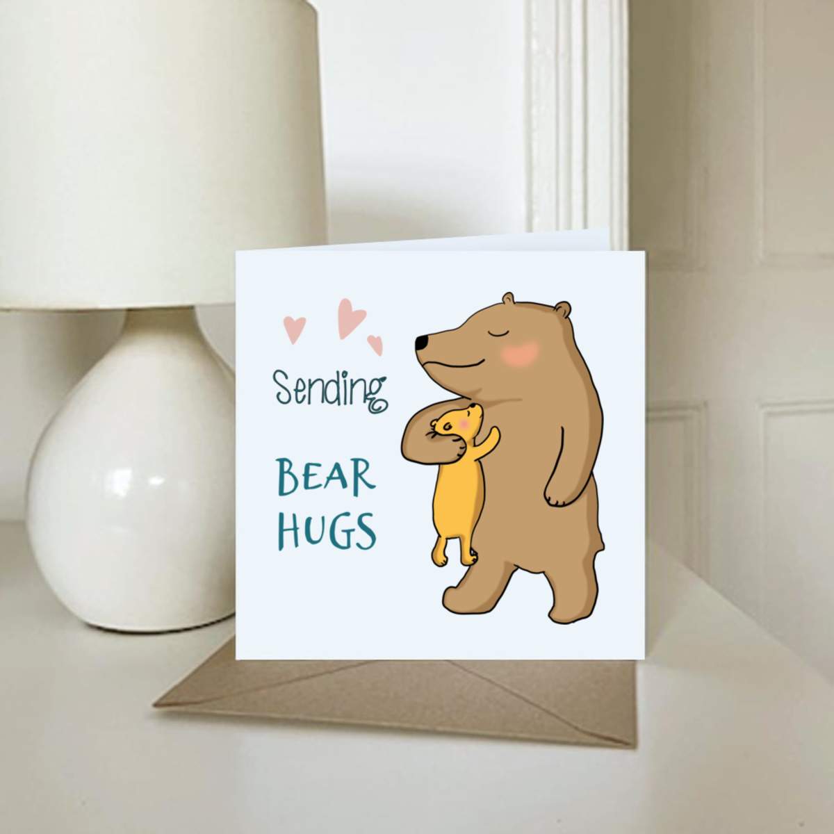 - Square greeting card supplied with a recycled brown envelope