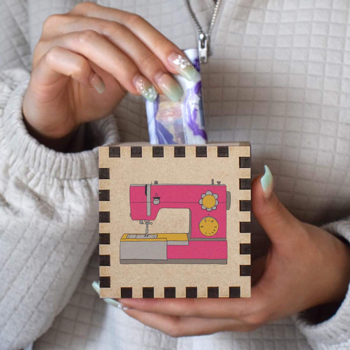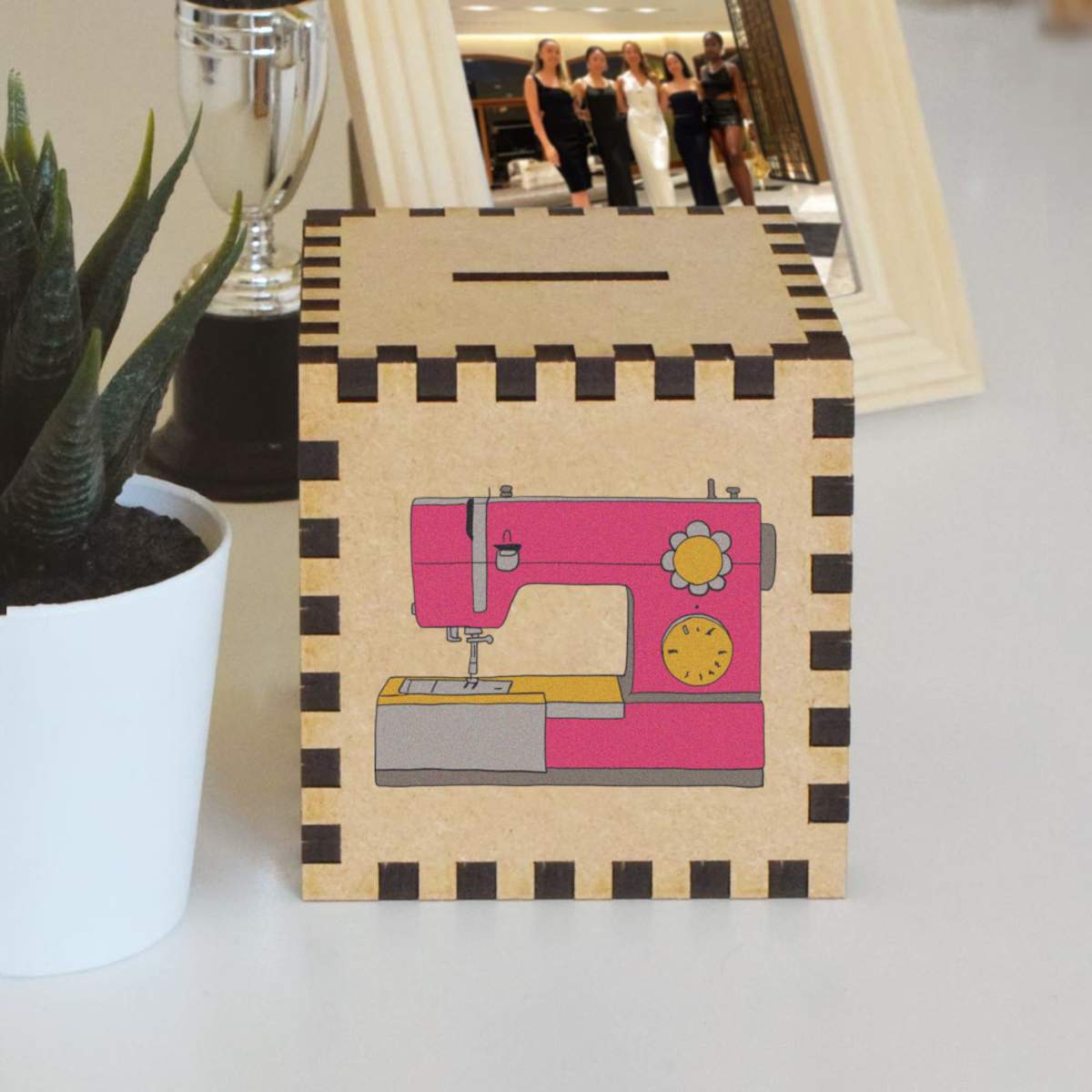 An 8.5cm wooden money box made out of the finest quality MDF and printed on all four sides with a unique design. The bottom is flat and the top has a slot for coins, the box itself is 85mm on each side, with a 35mm x 5mm coin slot, so please be sure it's suitable for you.