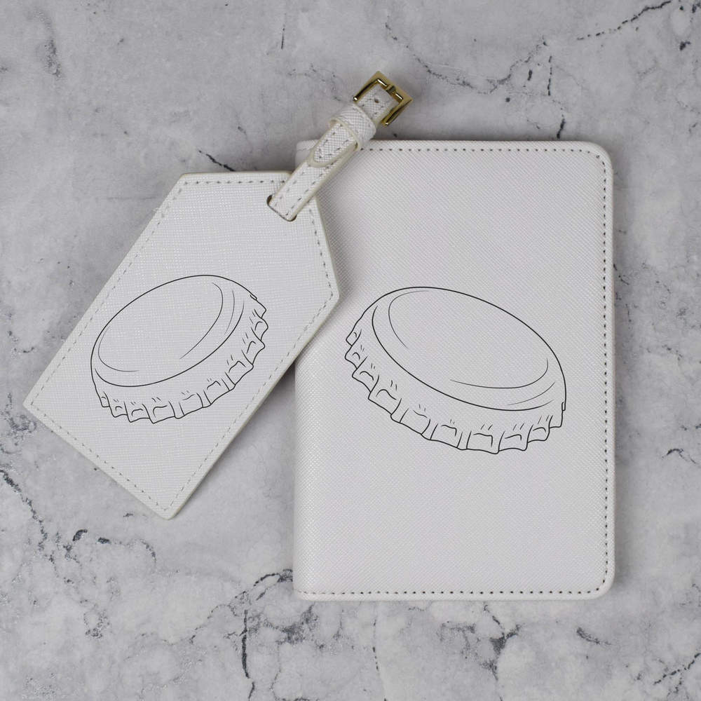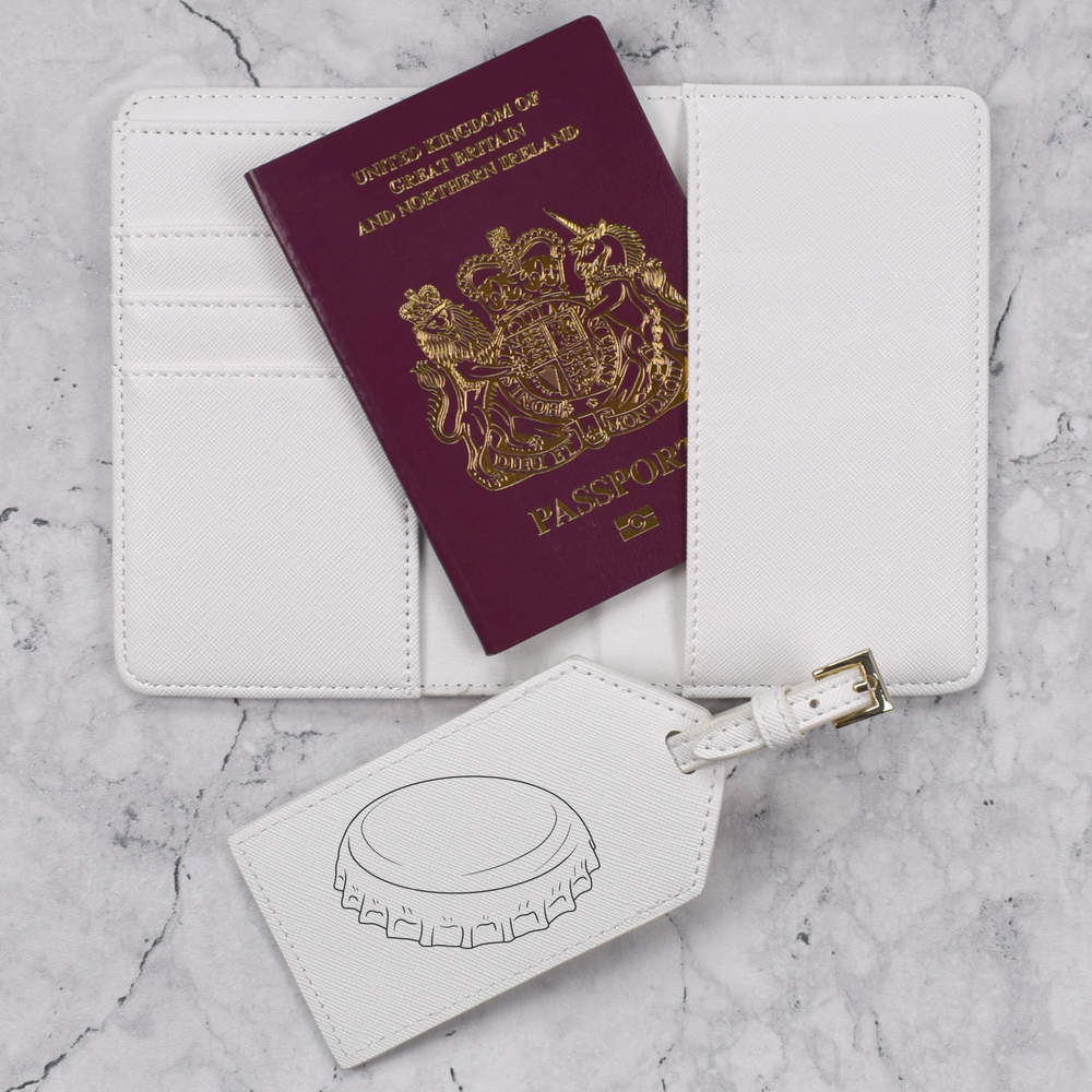A luxury travel set for holiday makers and jet setters! This premium duo consists of a passport cover and matching luggage tag; both made from white, leather-look PU and printed with a unique design.