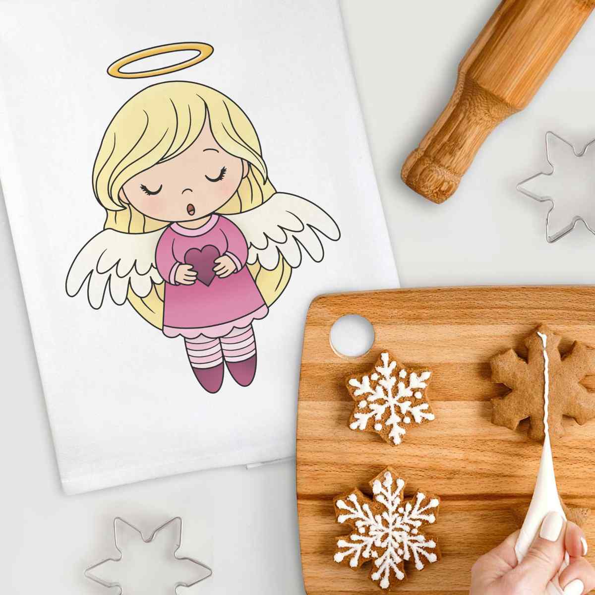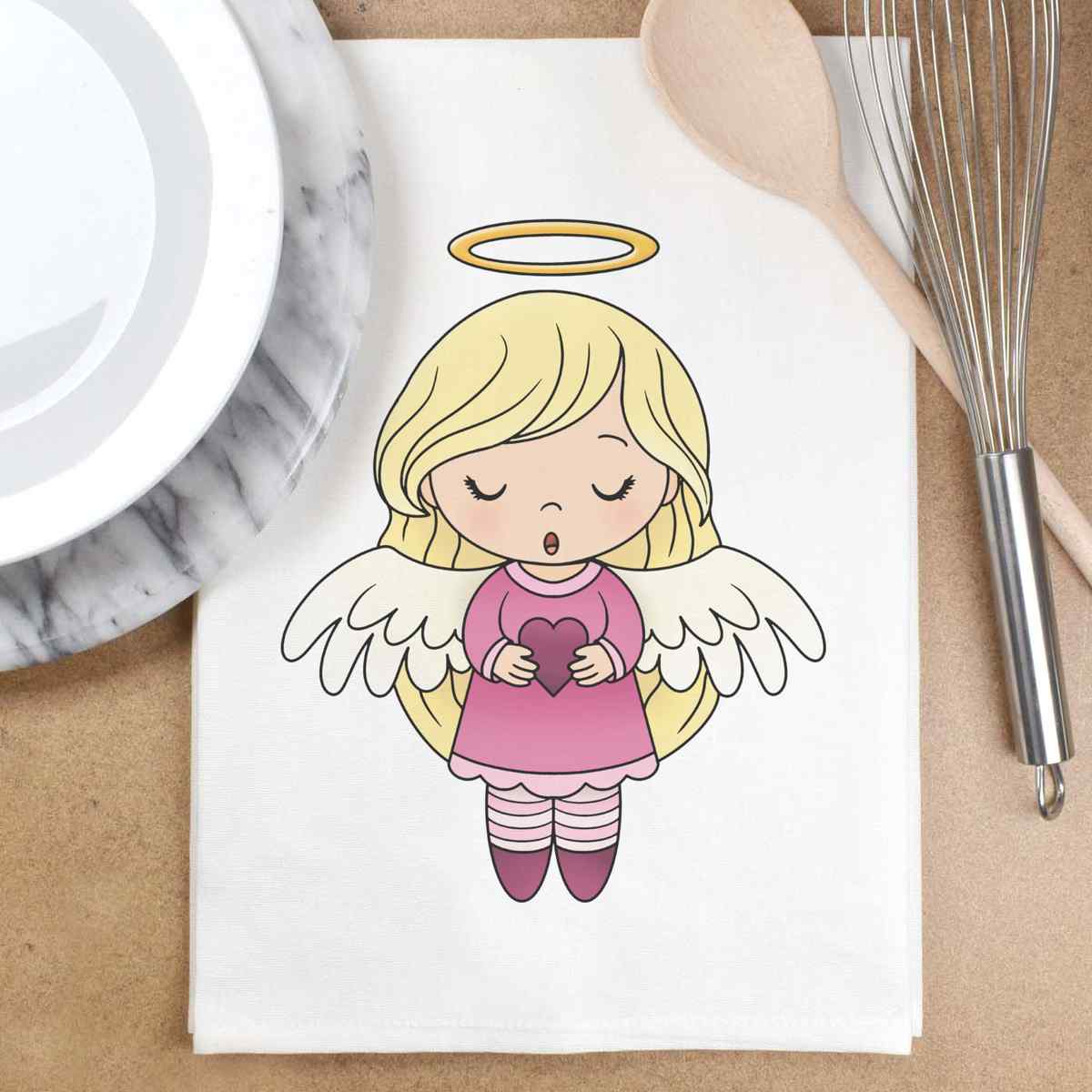 'A cute angel girl singing whilst holding a heart.'