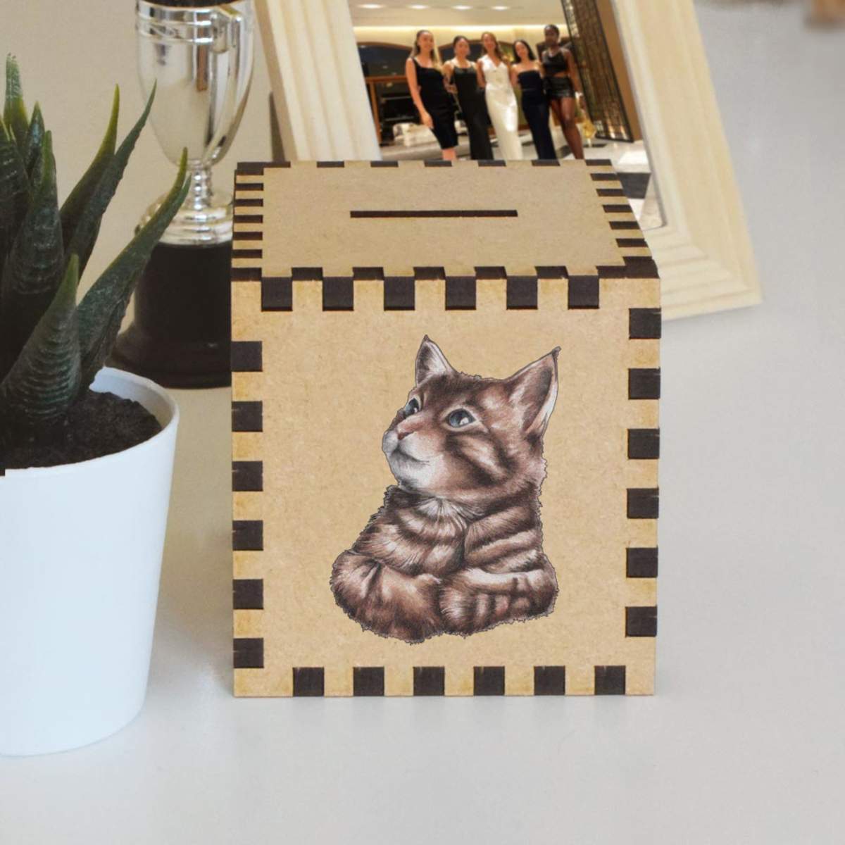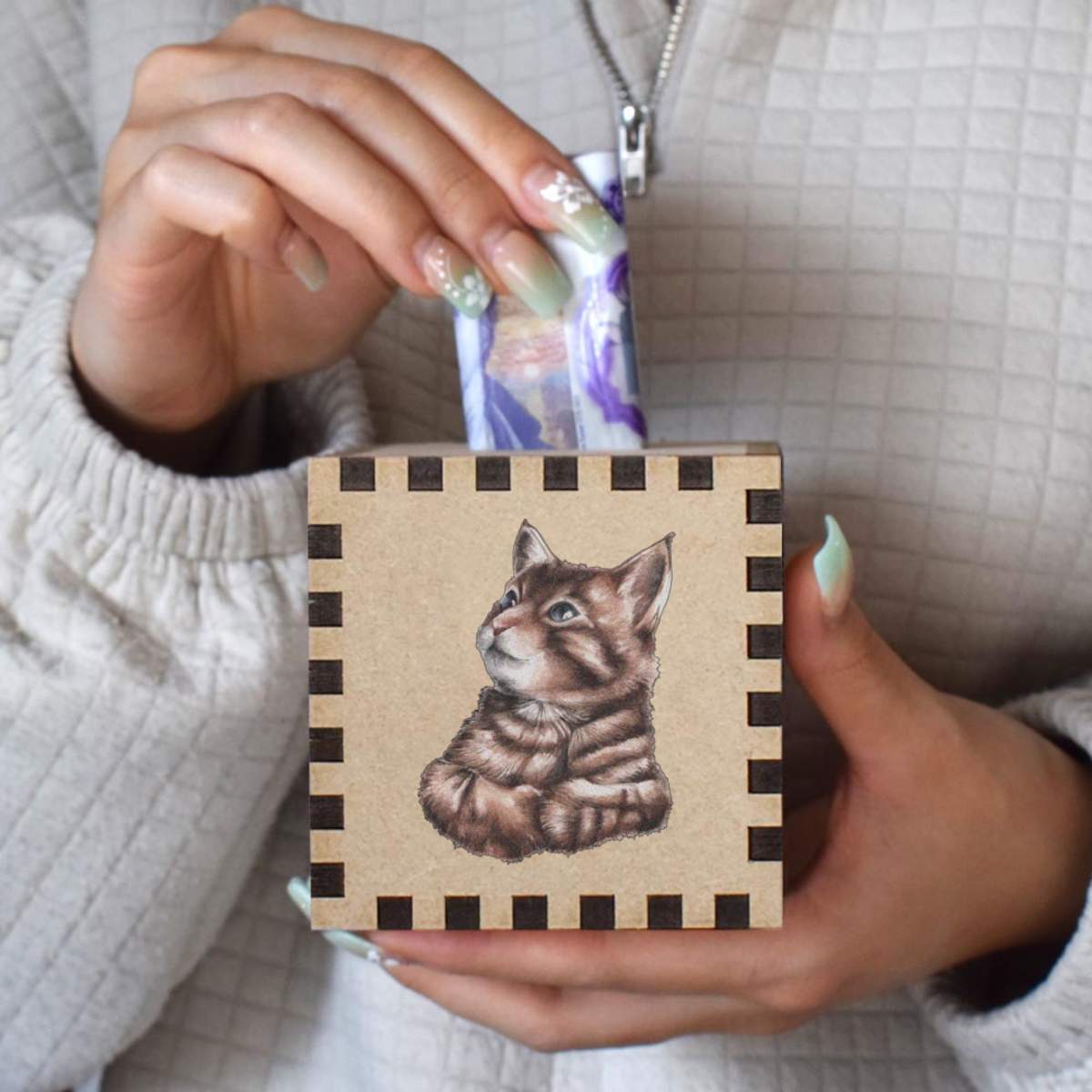 An 8.5cm wooden money box made out of the finest quality MDF and printed on all four sides with a unique design. The bottom is flat and the top has a slot for coins, the box itself is 85mm on each side, with a 35mm x 5mm coin slot, so please be sure it's suitable for you.