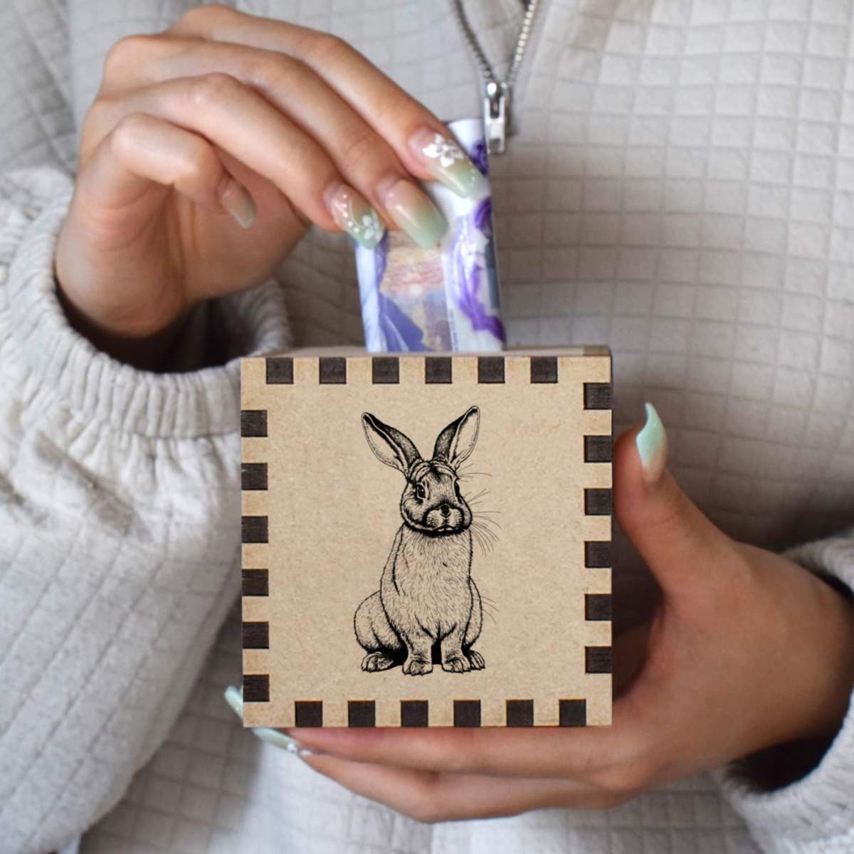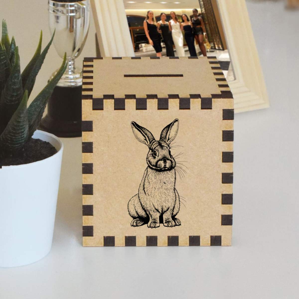 An 8.5cm wooden money box made out of the finest quality MDF and printed on all four sides with a unique design. The bottom is flat and the top has a slot for coins, the box itself is 85mm on each side, with a 35mm x 5mm coin slot, so please be sure it's suitable for you.