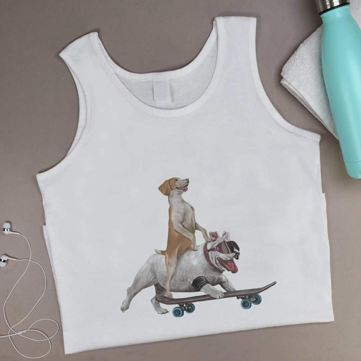 'A bulldog maneuvers a skateboard confidently with another dog riding on his back, capturing the essence of teamwork and adventure. The dynamic scene showcases their fun and fearless spirit on wheels.'