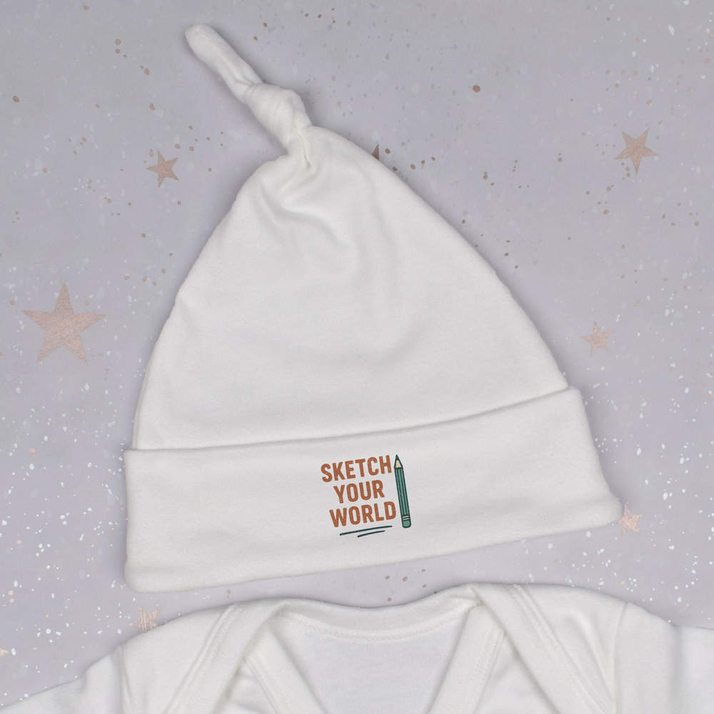 Keep little ones cosy and stylish with this super soft beanie hat. Our baby beanie hats have a knotted top and are printed on the turnover with a unique design. Made from 100% cotton, it can be machine washed and still retain its shape. This beanie hat has a stretch fit so one size fits all, with an approximate circumference of 32cm, it's ideal for babies up to 12 months old.