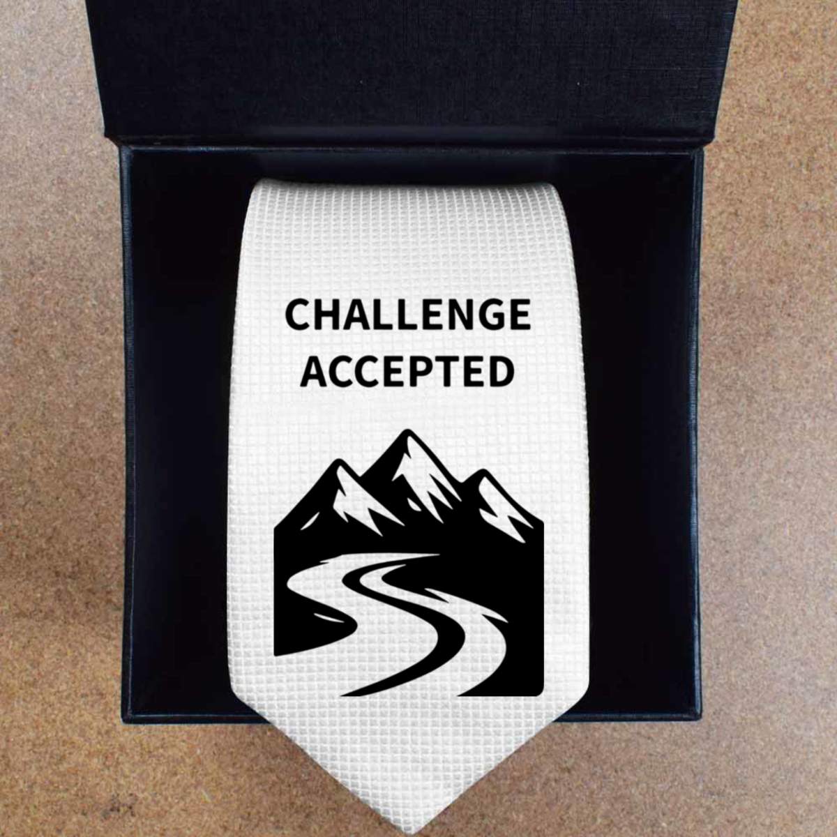 - Slim white tie with black presentation box