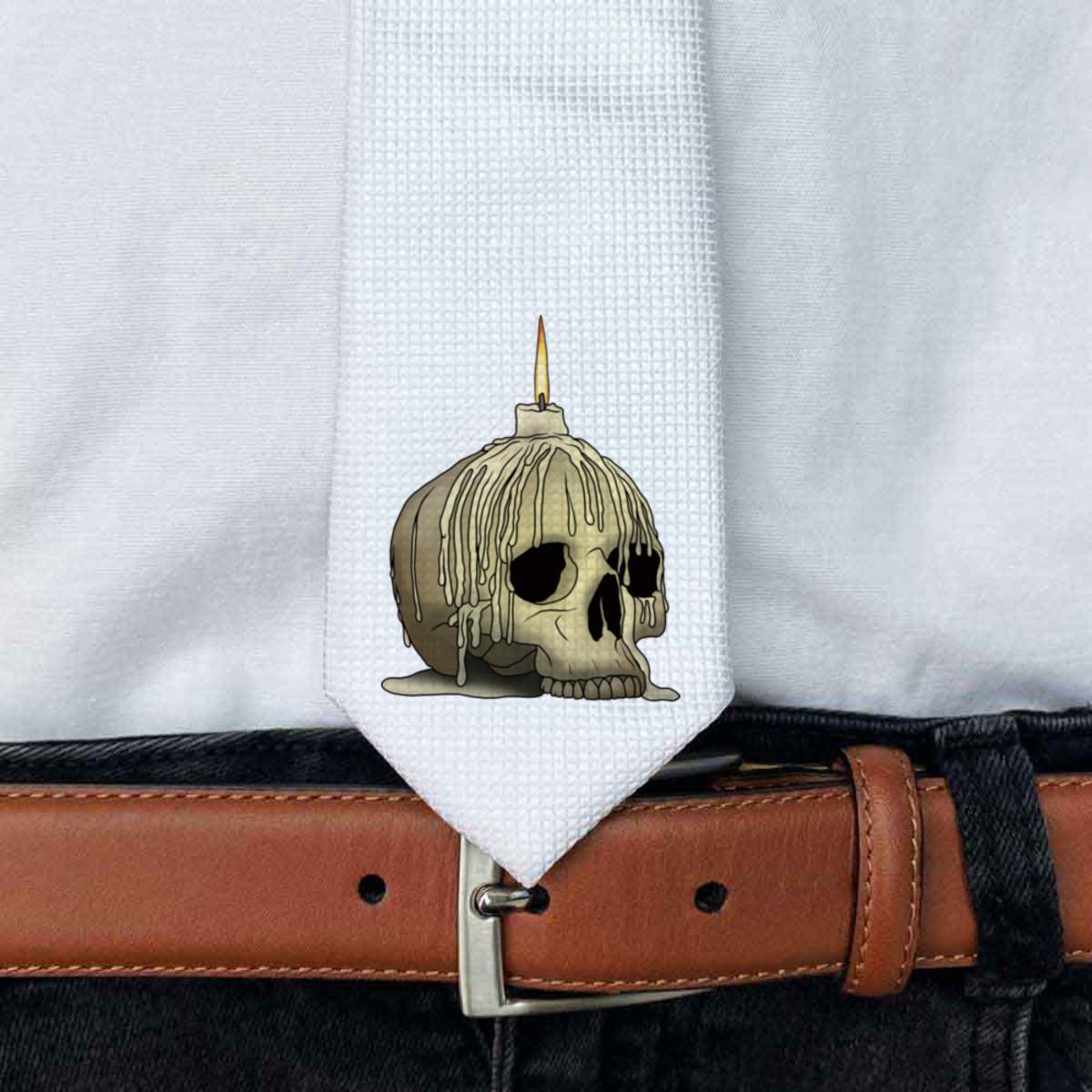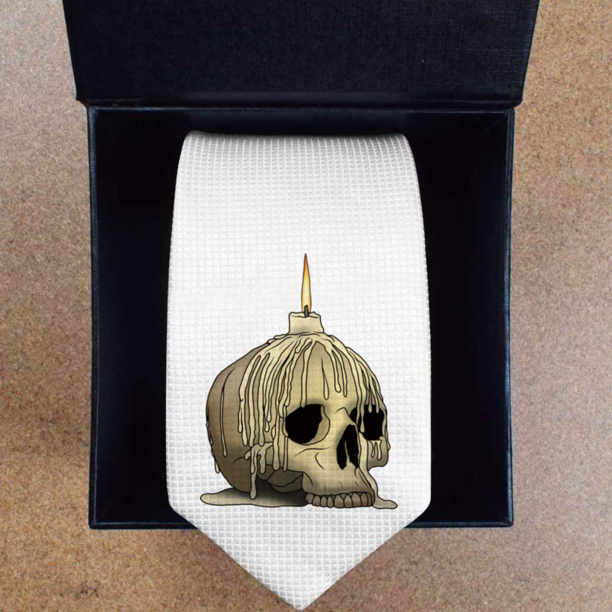 This stylish slim white tie is guaranteed to add class to any outfit. Printed on the front with a design from one of our talented designers, these ties are perfect for formal events, special occasions or making a statement at the office.