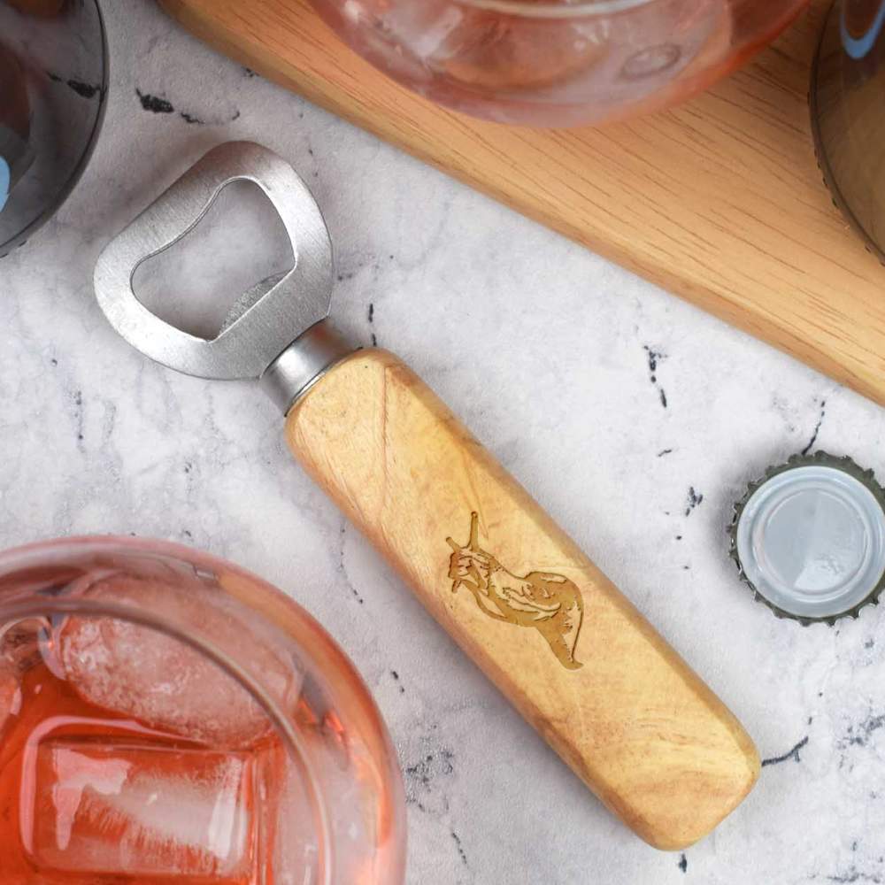 This beautiful wooden bottle opener is made from high quality beech wood and is engraved on one side with a unique design. It's practically sized for pockets and easily wiped clean, making it great for outdoor adventures and travelling.