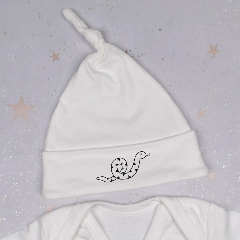 Keep little ones cosy and stylish with this super soft beanie hat. Our baby beanie hats have a knotted top and are printed on the turnover with a unique design. Made from 100% cotton, it can be machine washed and still retain its shape. This beanie hat has a stretch fit so one size fits all, with an approximate circumference of 32cm, it's ideal for babies up to 12 months old.