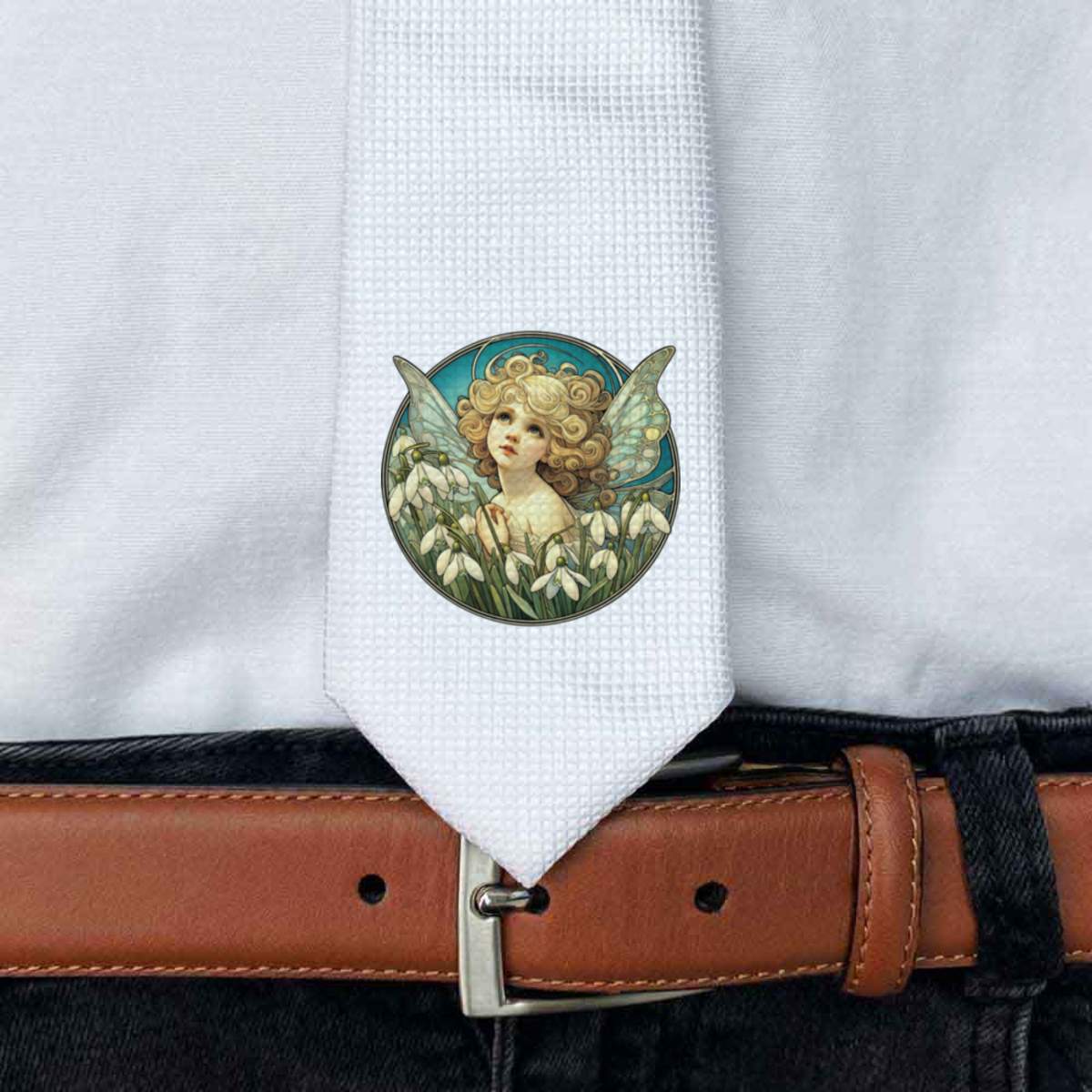 This stylish slim white tie is guaranteed to add class to any outfit. Printed on the front with a design from one of our talented designers, these ties are perfect for formal events, special occasions or making a statement at the office.