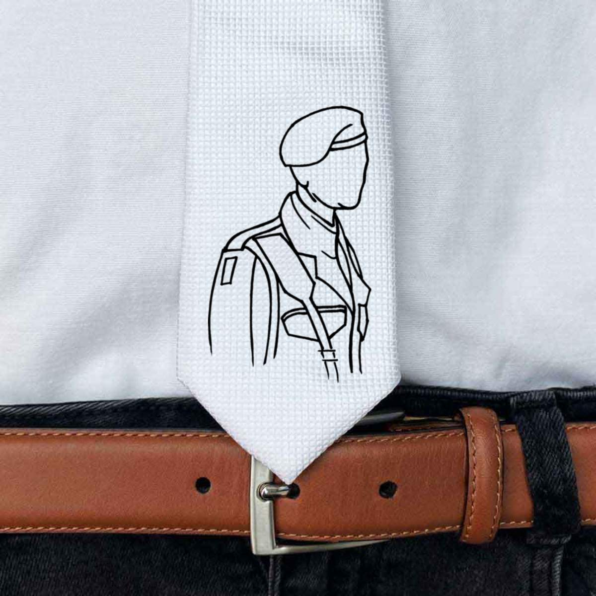 This stylish slim white tie is guaranteed to add class to any outfit. Printed on the front with a design from one of our talented designers, these ties are perfect for formal events, special occasions or making a statement at the office.