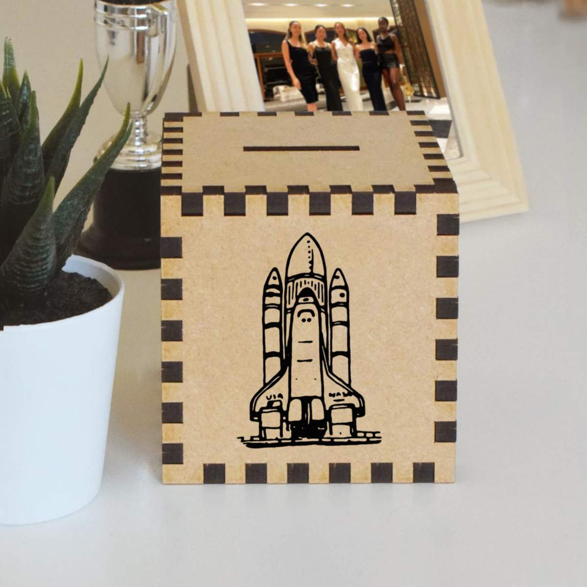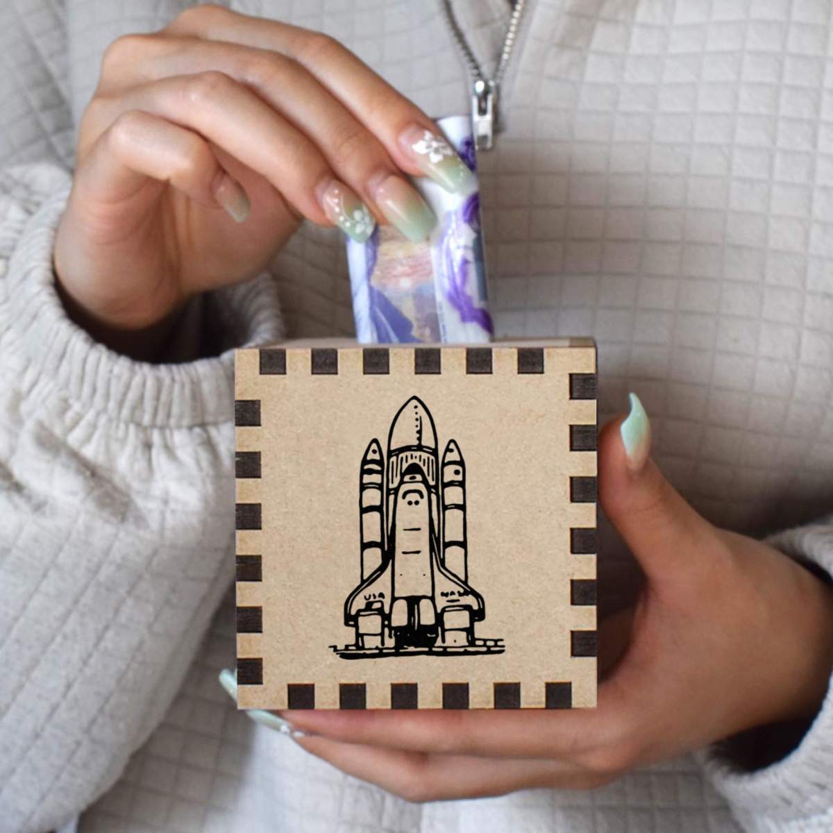 An 8.5cm wooden money box made out of the finest quality MDF and printed on all four sides with a unique design. The bottom is flat and the top has a slot for coins, the box itself is 85mm on each side, with a 35mm x 5mm coin slot, so please be sure it's suitable for you.
