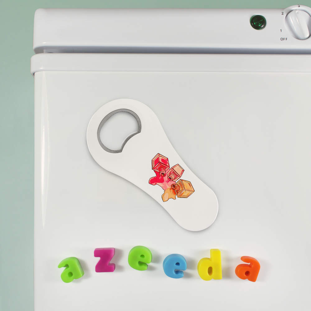 Pop the top where ever you are with this slim, lightweight bottle opener. Made from durable white plastic and printed on one side with a unique design. The back of the bottle opener has a small magnet, making it easy to stick to a fridge full of beer