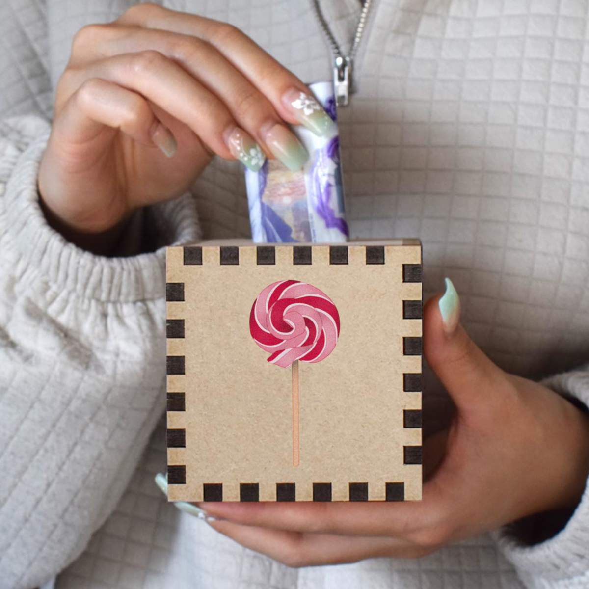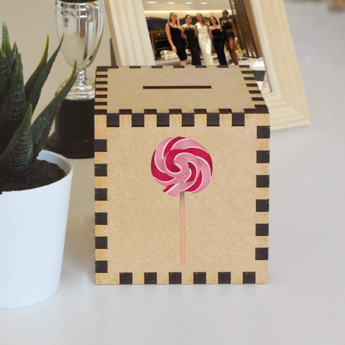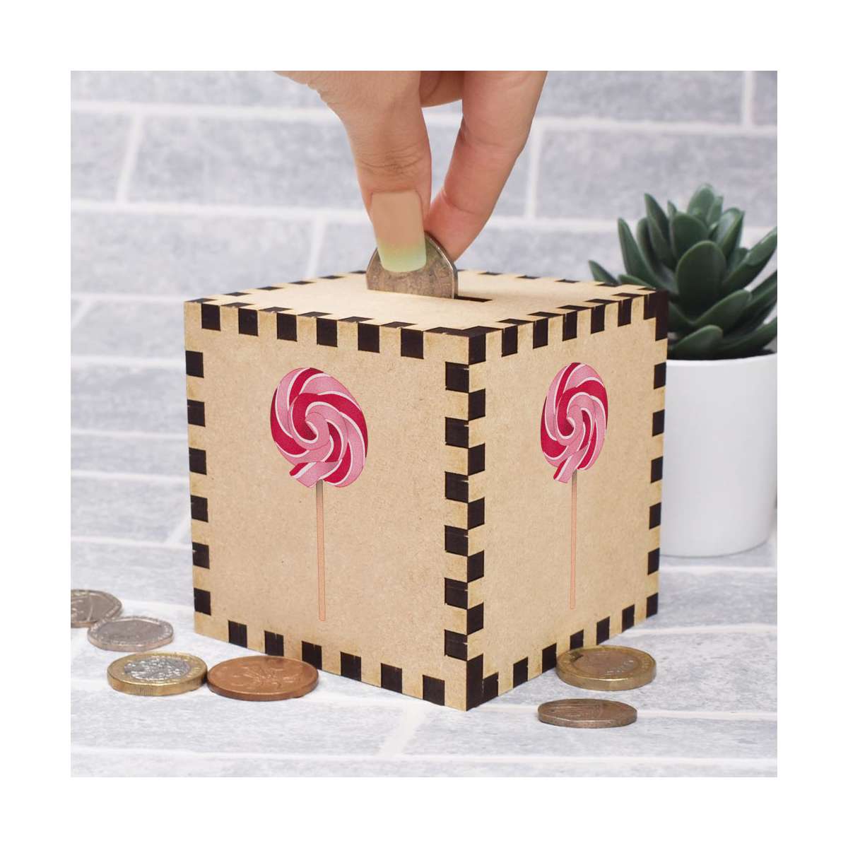 An 8.5cm wooden money box made out of the finest quality MDF and printed on all four sides with a unique design. The bottom is flat and the top has a slot for coins, the box itself is 85mm on each side, with a 35mm x 5mm coin slot, so please be sure it's suitable for you.
