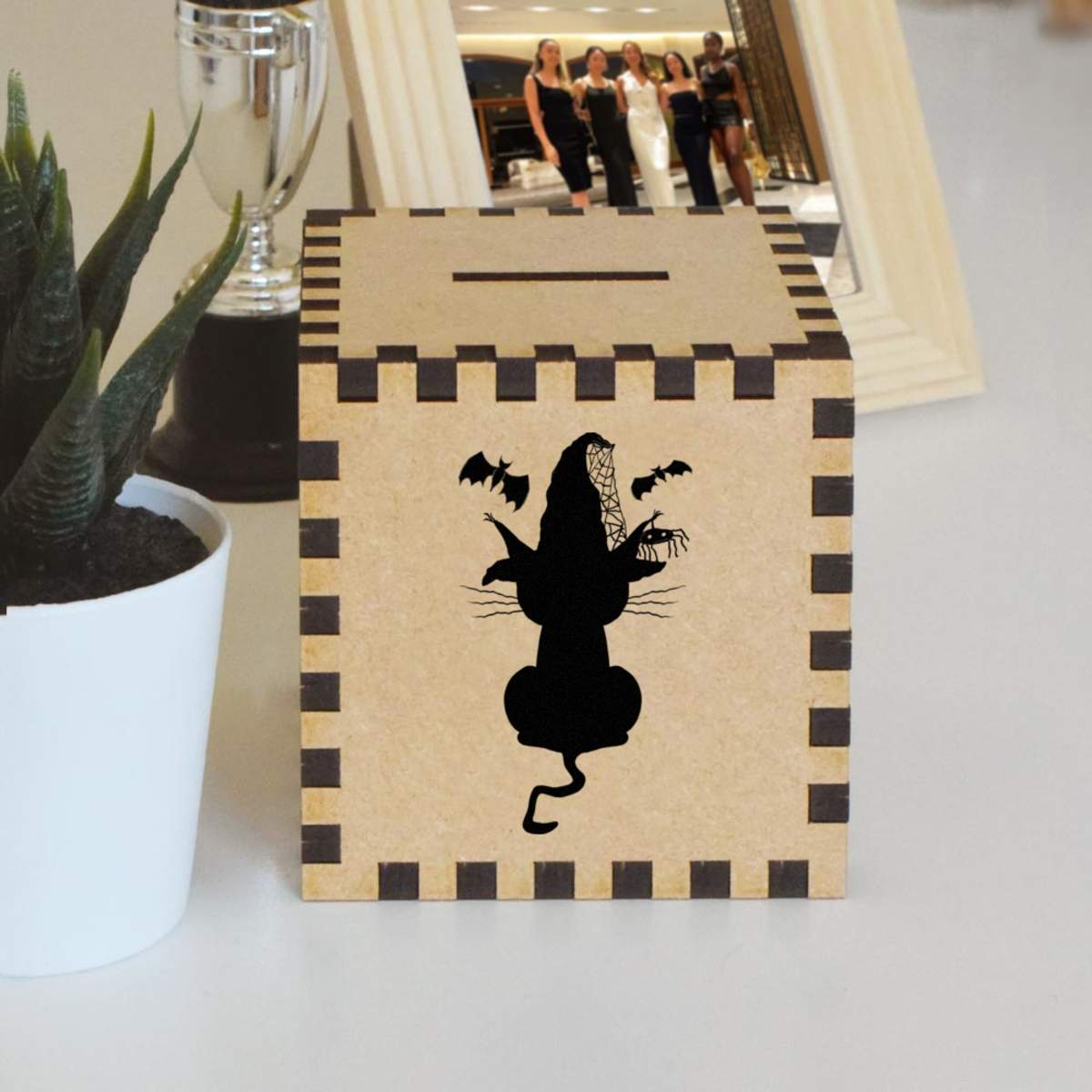 An 8.5cm wooden money box made out of the finest quality MDF and printed on all four sides with a unique design. The bottom is flat and the top has a slot for coins, the box itself is 85mm on each side, with a 35mm x 5mm coin slot, so please be sure it's suitable for you.