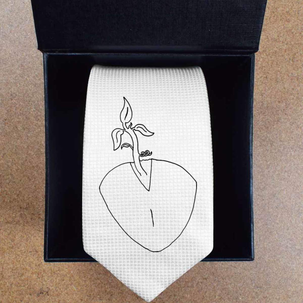This stylish slim white tie is guaranteed to add class to any outfit. Printed on the front with a design from one of our talented designers, these ties are perfect for formal events, special occasions or making a statement at the office.