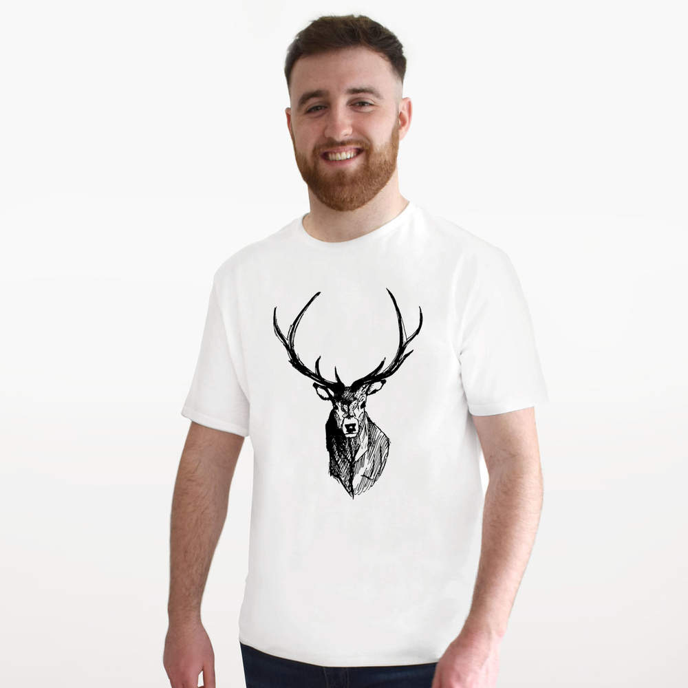 'Stag Head' Unisex T-Shirt - Elegant Deer Antlers Wildlife Illustration - 100 % Cotton, White, XXL (TA00230000)