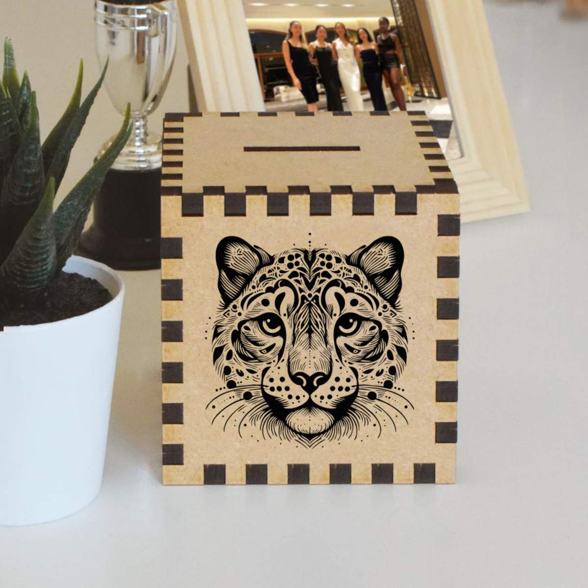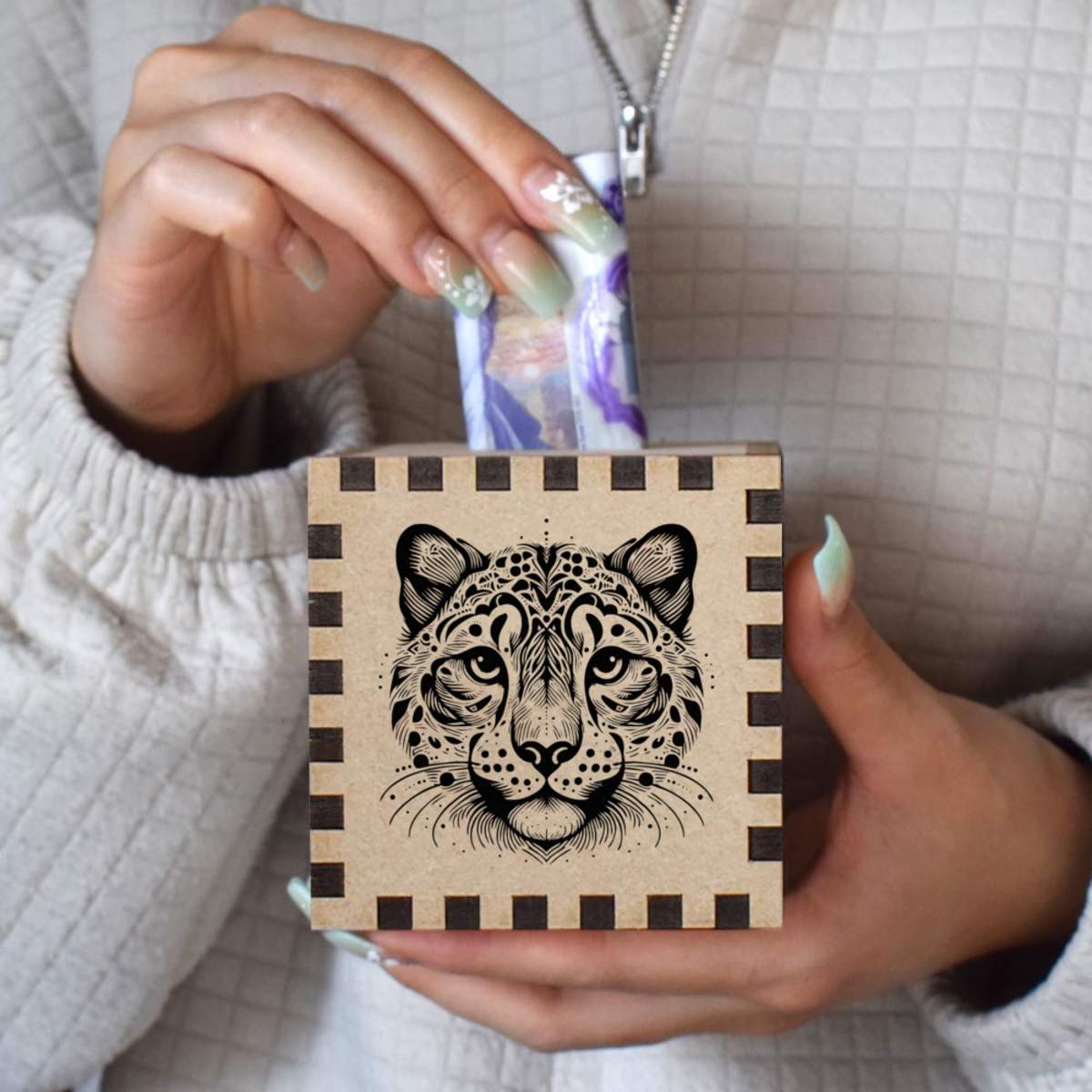 An 8.5cm wooden money box made out of the finest quality MDF and printed on all four sides with a unique design. The bottom is flat and the top has a slot for coins, the box itself is 85mm on each side, with a 35mm x 5mm coin slot, so please be sure it's suitable for you.