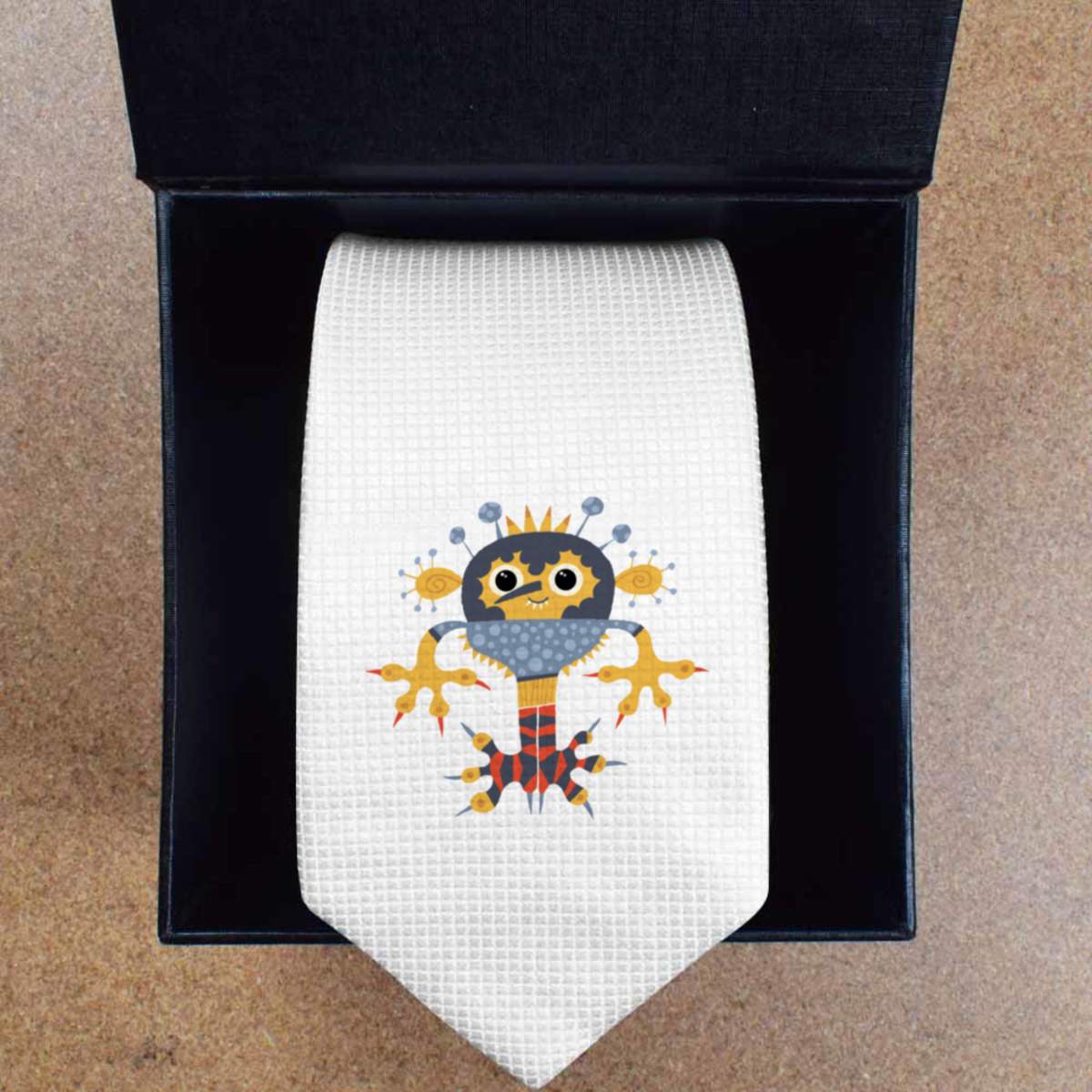 This stylish slim white tie is guaranteed to add class to any outfit. Printed on the front with a design from one of our talented designers, these ties are perfect for formal events, special occasions or making a statement at the office.