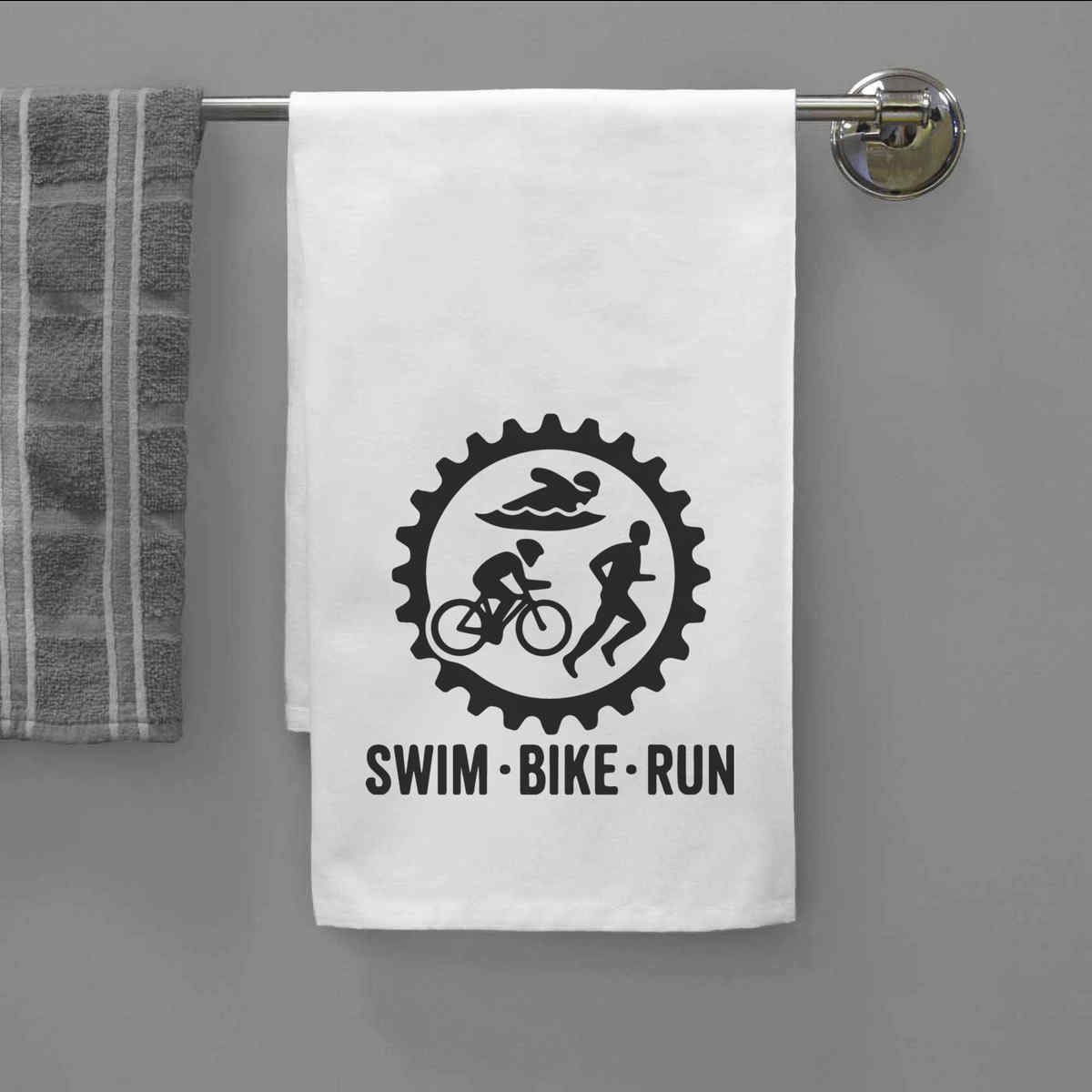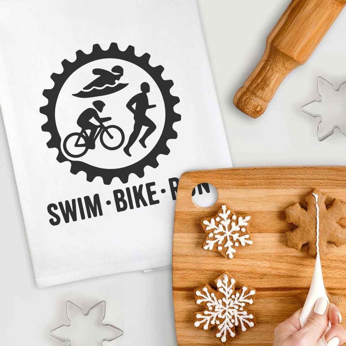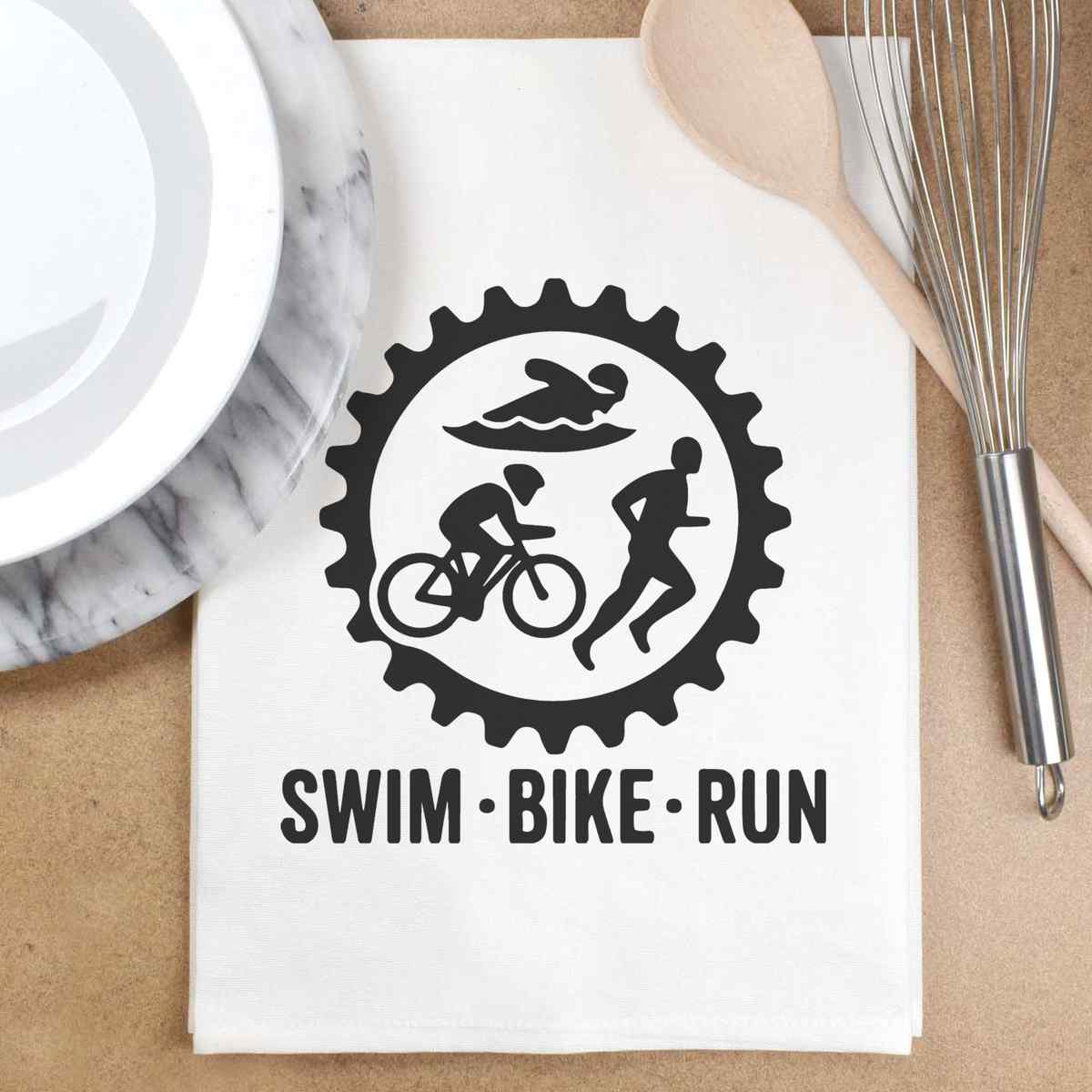 'This striking emblem captures the spirit of the triathlon with silhouettes of a swimmer, cyclist, and runner inside a cog.'
