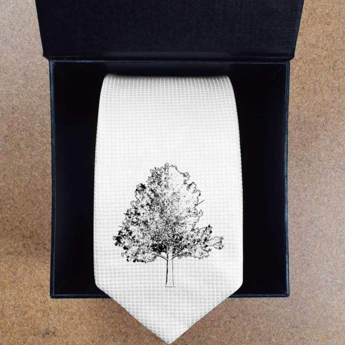 This stylish slim white tie is guaranteed to add class to any outfit. Printed on the front with a design from one of our talented designers, these ties are perfect for formal events, special occasions or making a statement at the office.