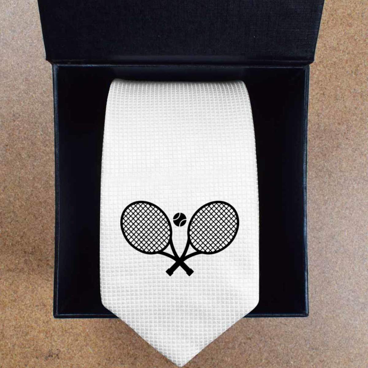 - Slim white tie with black presentation box