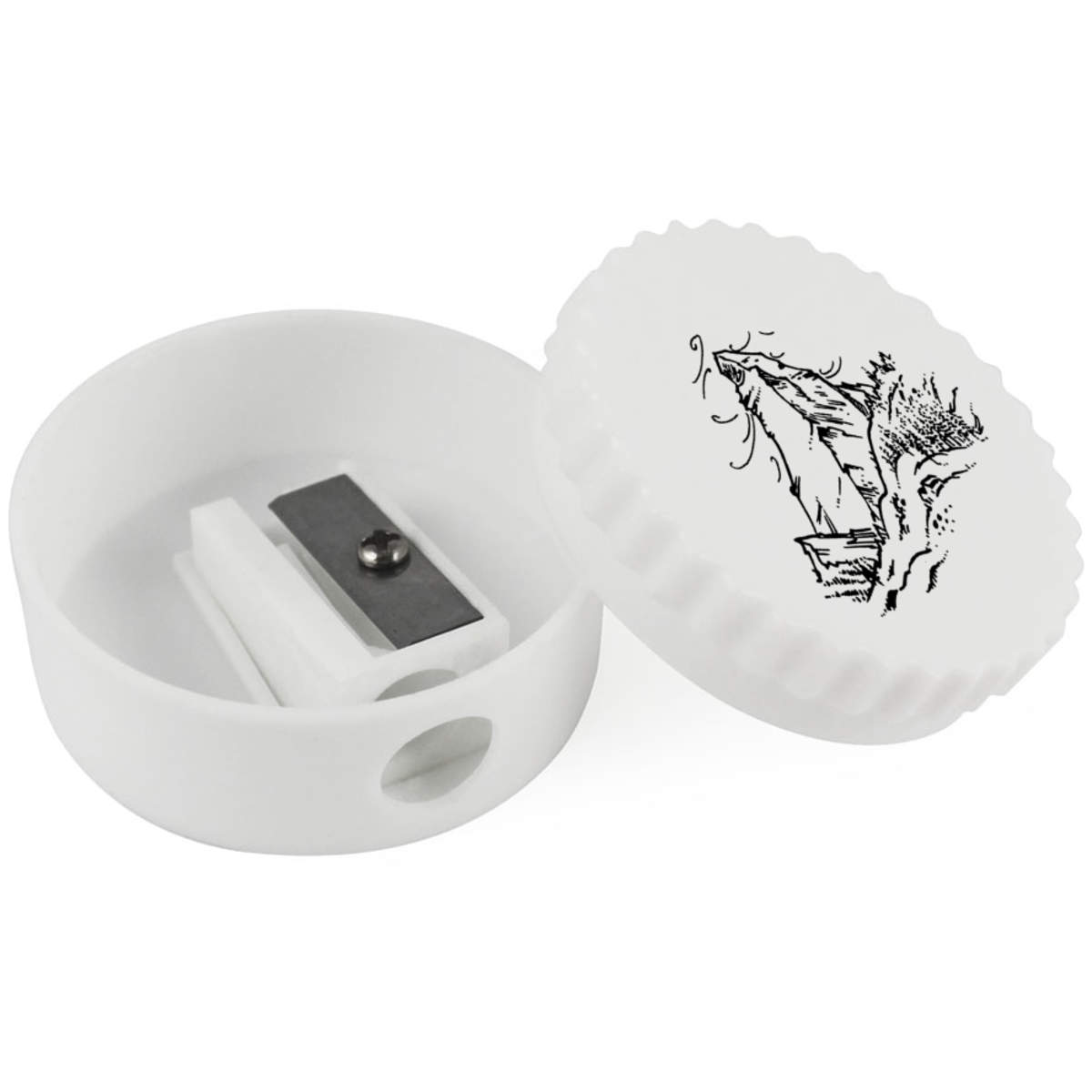 Keep your pencils sharp and ready to use with this sturdy, single hole sharpener featuring one of our awesome designs. The twisting lid conceals the hole to the blade and removes completely to allow shavings to be discarded.