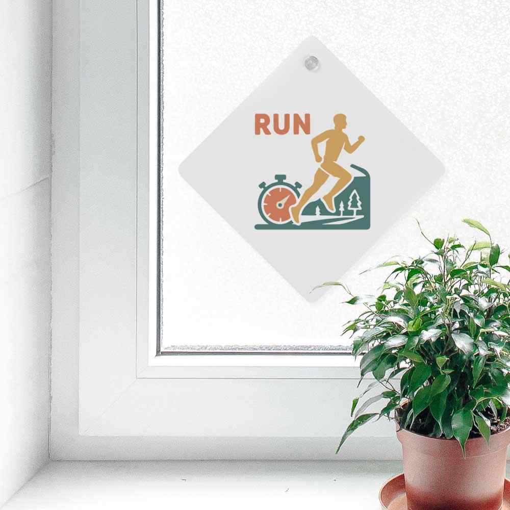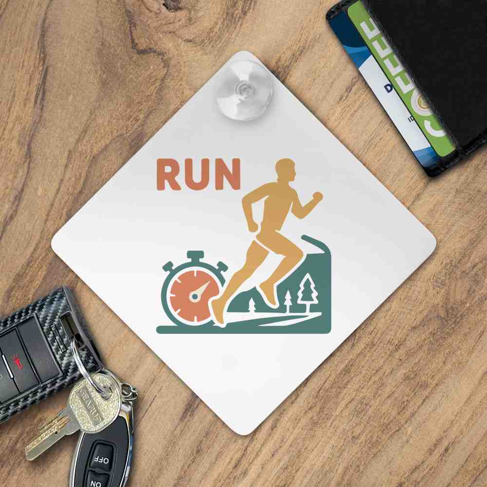 'This design features a runner in motion with a stopwatch, representing the dedication and discipline of timed running and fitness.'