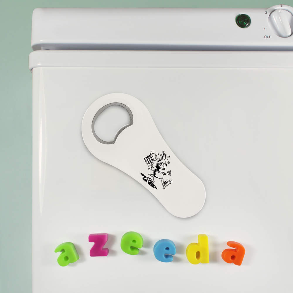 Pop the top where ever you are with this slim, lightweight bottle opener. Made from durable white plastic and printed on one side with a unique design. The back of the bottle opener has a small magnet, making it easy to stick to a fridge full of beer