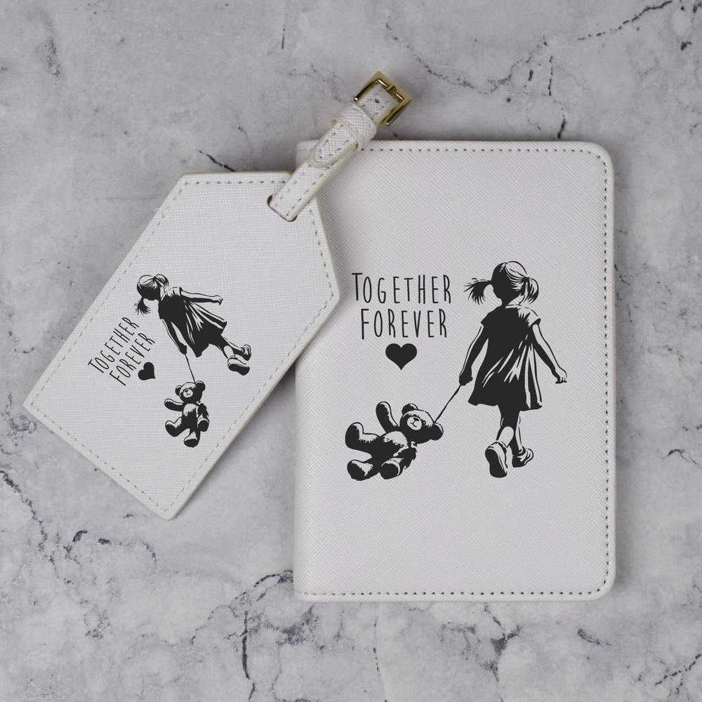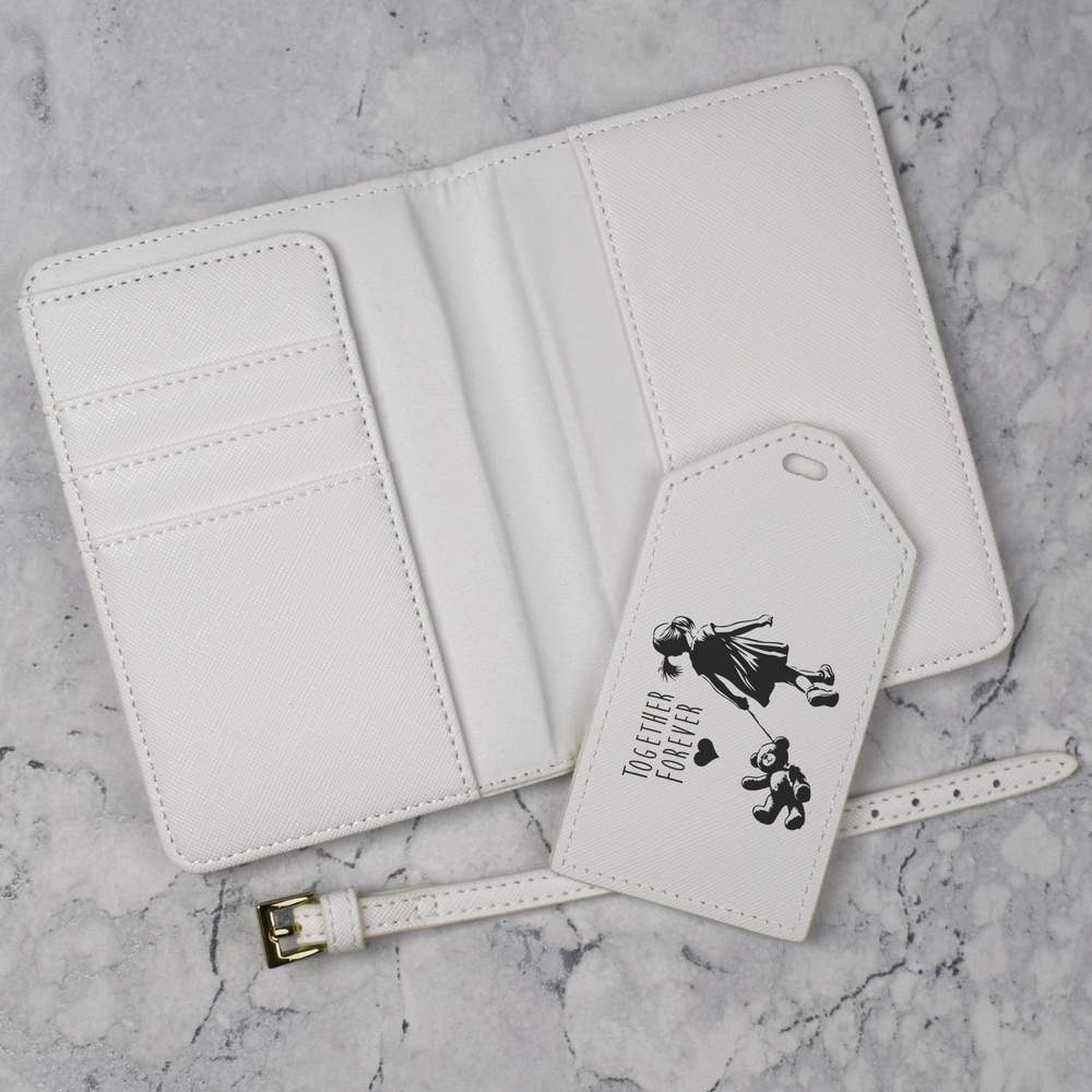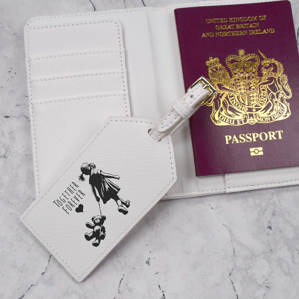 A luxury travel set for holiday makers and jet setters! This premium duo consists of a passport cover and matching luggage tag; both made from white, leather-look PU and printed with a unique design.