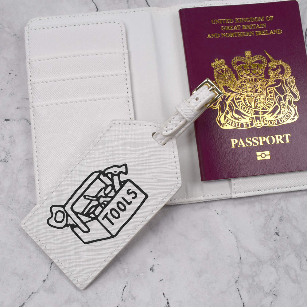 A luxury travel set for holiday makers and jet setters! This premium duo consists of a passport cover and matching luggage tag; both made from white, leather-look PU and printed with a unique design.