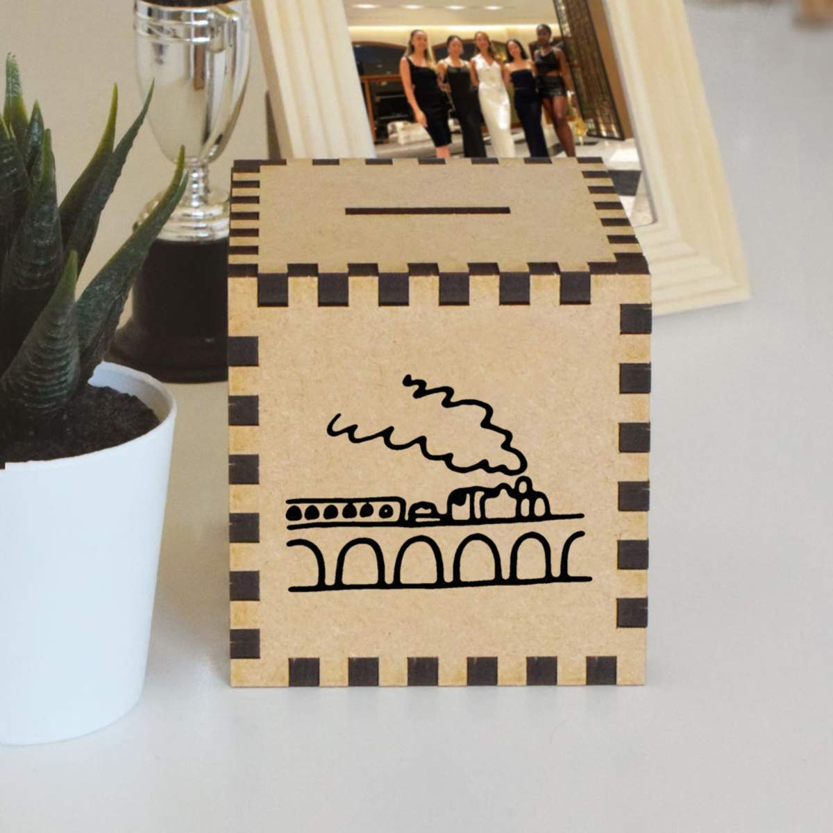 An 8.5cm wooden money box made out of the finest quality MDF and printed on all four sides with a unique design. The bottom is flat and the top has a slot for coins, the box itself is 85mm on each side, with a 35mm x 5mm coin slot, so please be sure it's suitable for you.